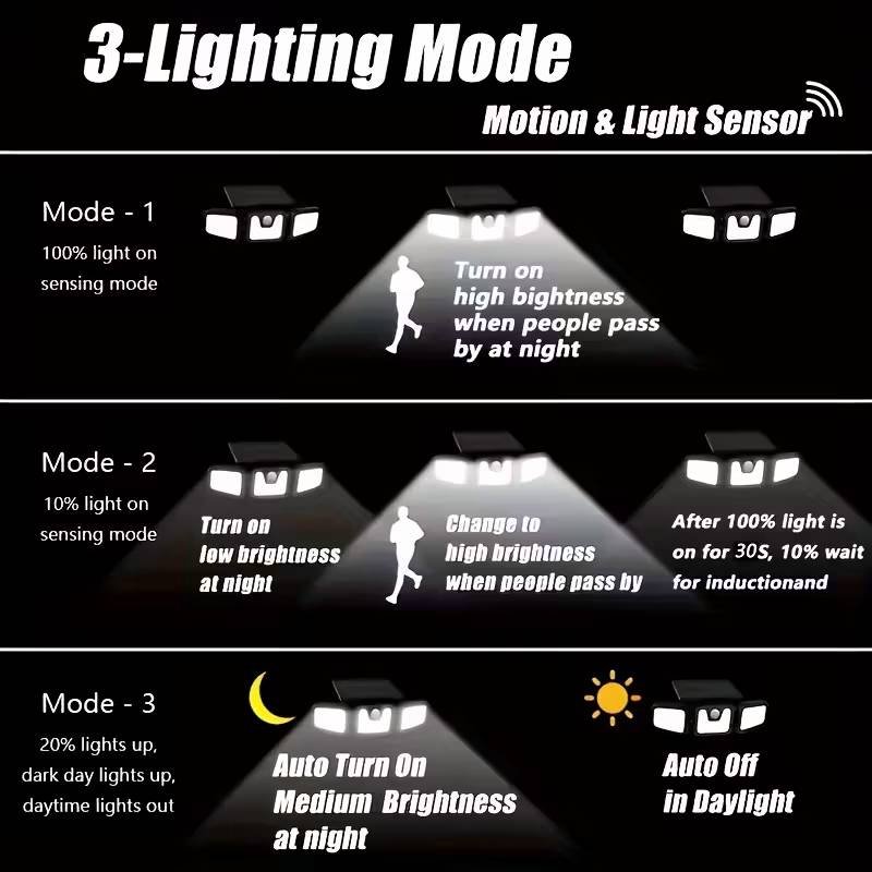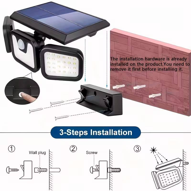 This two-piece 74-LED solar outdoor sensor light adopts high-efficiency solar panels and intelligent motion sensing technology, providing your home with a safe, energy-saving and reliable lighting solution. No wiring required, easy to install, suitable for various outdoor environments, including front door entrances, courtyard paths, garage entrances, terraces, fences and garden areas.