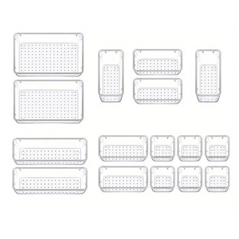 Transform your chaotic junk drawers and cluttered desktops into a masterpiece of organization with our Modular Clear Storage Bin Set. Crafted from premium, high-transparency PS material, these bins offer a crystal-clear view of your essentials, from delicate jewelry and makeup to office supplies and kitchen gadgets. The intelligent grid-based sizing allows you to mix and match different dimensions to fit any drawer or shelf perfectly with four distinct sizes.