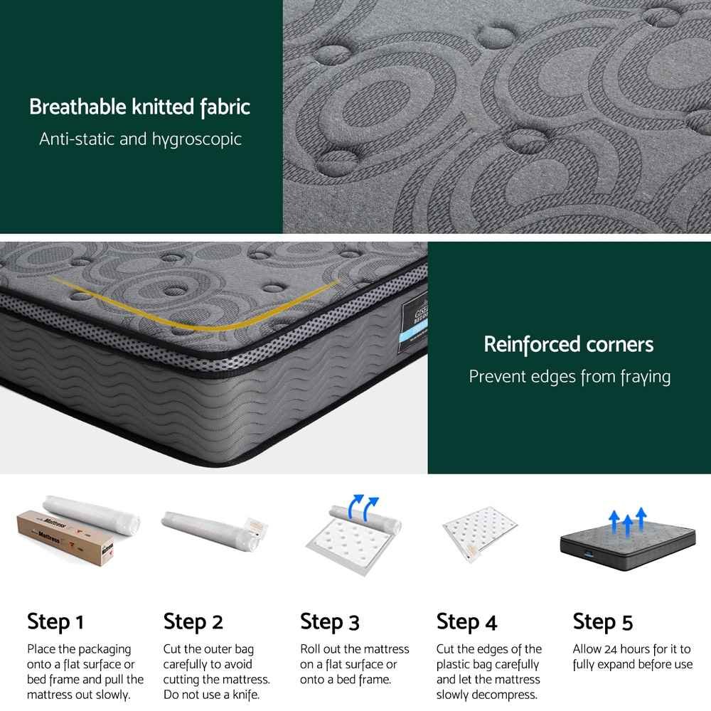 The Giselle Bedding Euro Top Mattress from the Reverie Series offers comfort and support with its 26cm thick profile. Featuring a Euro Top design, this mattress provides a plush, cushion-like surface while maintaining medium-firm support for optimal spinal alignment. The 280g knitted fabric cover is soft and breathable, promoting airflow and ensuring a cool and restful sleep. Designed with an independent coil system and pocket springs, this mattress minimizes motion transfer, allowing for uninterrupted sleep throughout the night.