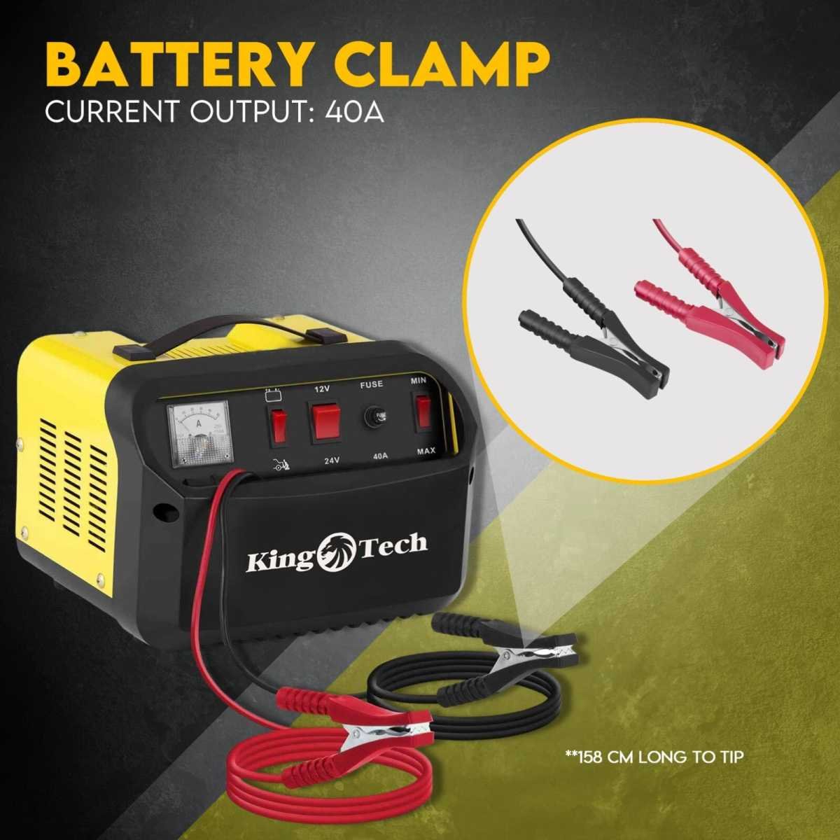 • Heavy-duty clamps and cables — Solid connections for safe starts.