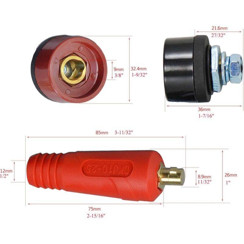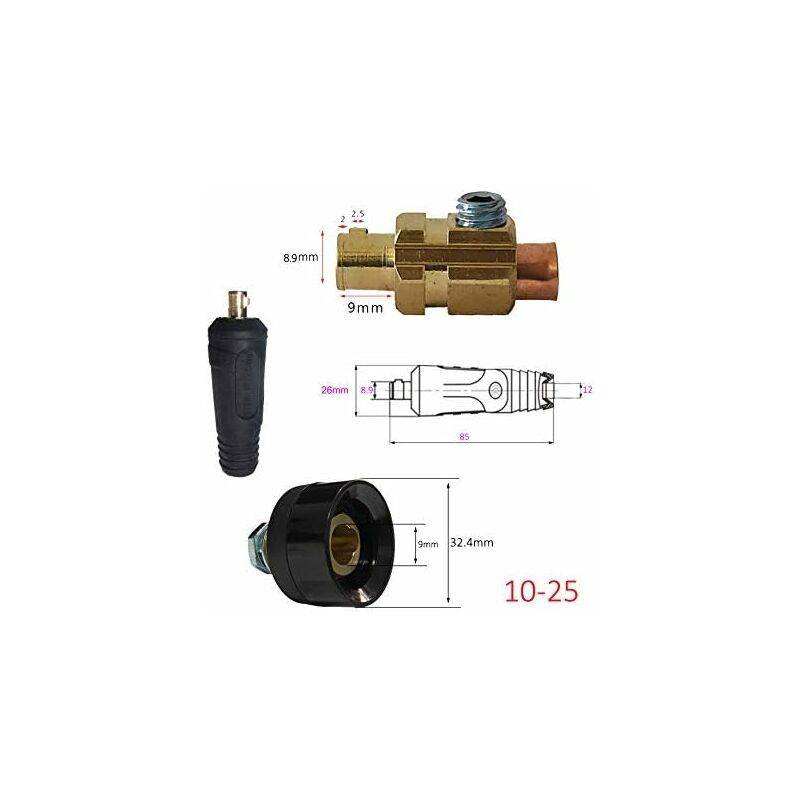 Welding Cable Panel Connector Quick Fitting 1pcs DKZ10-25 200A European Style Cable Connector-Plug Black Color Pack contains 2pcs 10-25mm Male Aerial Connectors and 2pcs 10-25mm Female Socket Connectors Rated Current 200A High quality copper alloy connector has very good oxidation resistance, high conductivity and long service life.