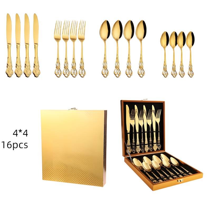 4Set / 16PCS Gold Royal Court Cutlery Set – Vintage Hollow Engraved 410 Stainless Steel Dinnerware with Gift Box