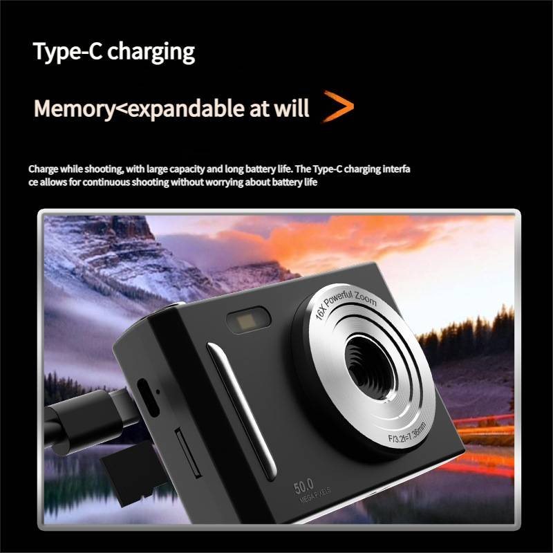Entry-level digital camera featuring 50-megapixel imaging and 1080P HD video recording. Equipped with front and rear lenses for versatile photography, built-in flash for low-light conditions, and beauty filters for enhanced portrait shots. The 8X digital zoom captures distant subjects with clarity.