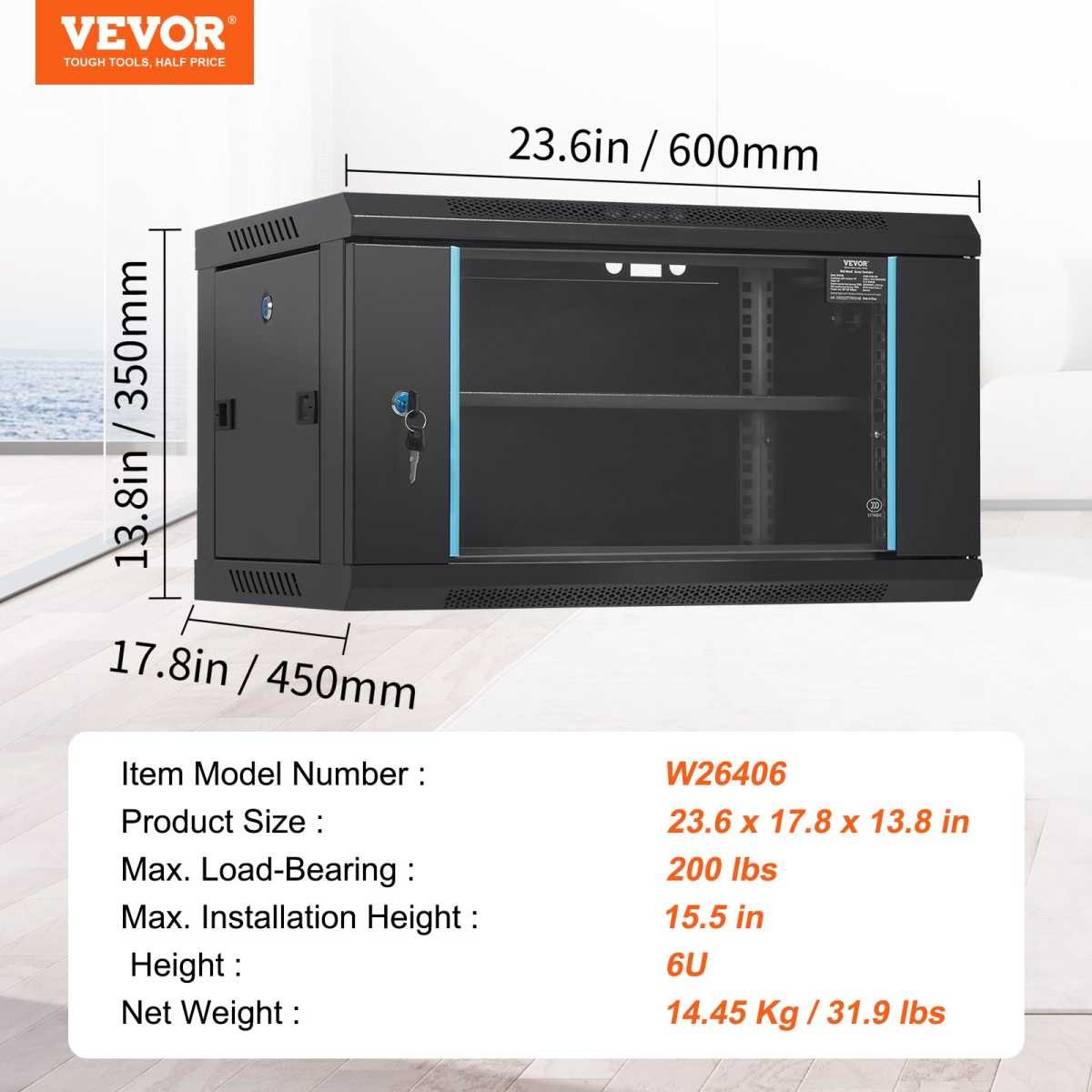6U Wall Mount Network Server Cabinet, 15.5” Deep, Server Rack Cabinet Enclosure, 200 lbs Max. Ground-mounted Load Capacity, with Locking Glass Door Side Panels, for IT Equipment, A/V Devices