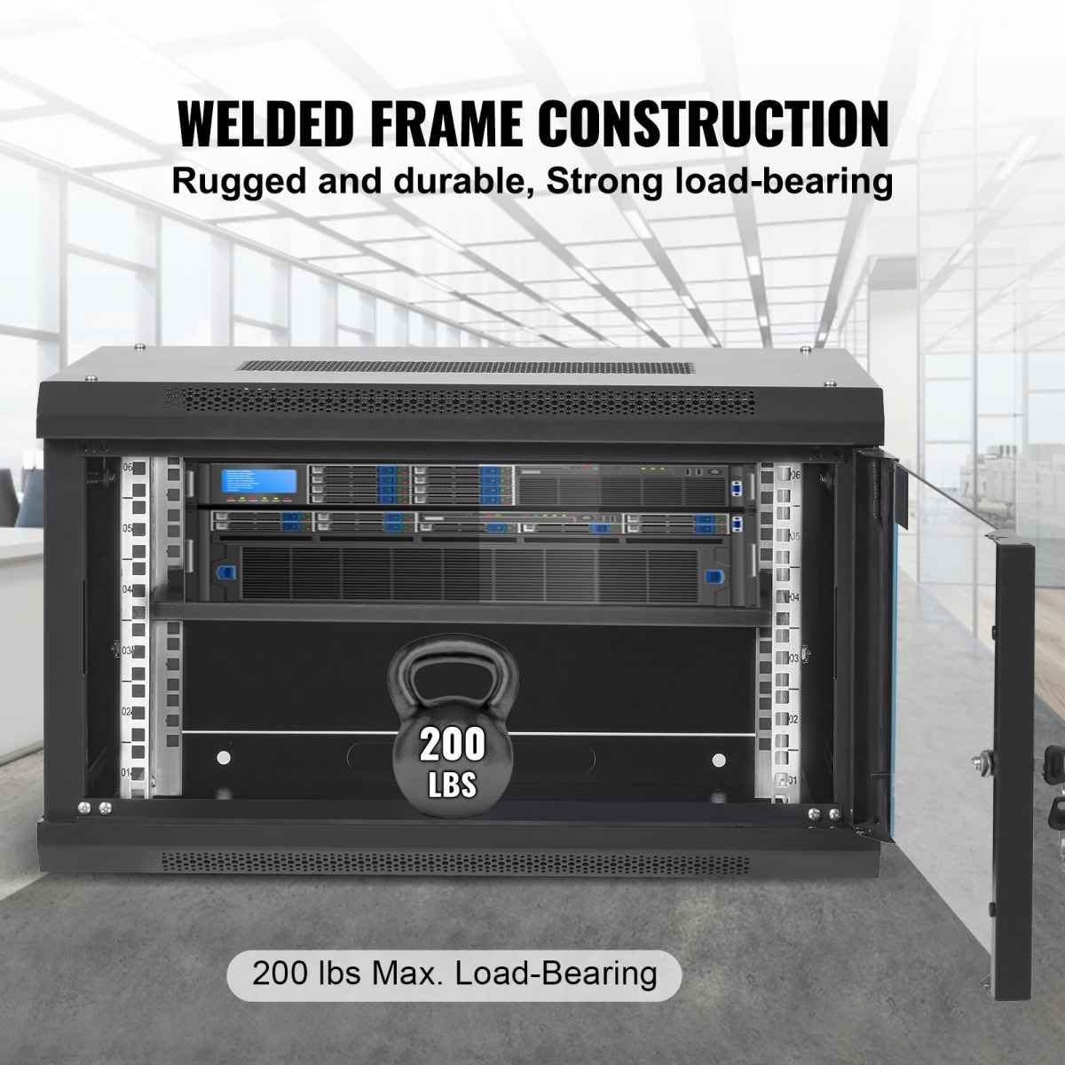 Robust welded frame construction for durability and long service life. With 100 lbs wall-mounted load capacity and 200 lbs ground-mounted load capacity, you can place multiple devices in the server rack cabinet as needed.