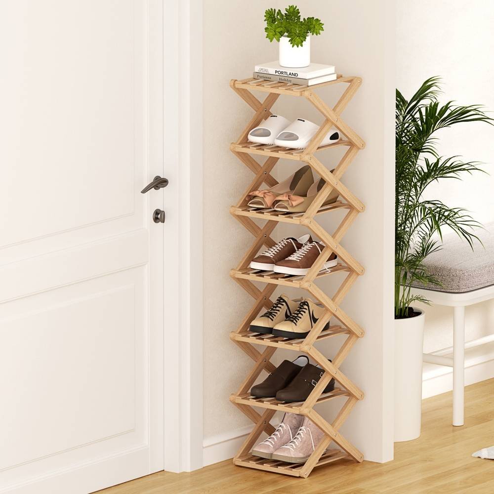 Maximise your space with this elegant Artiss shoe rack! Crafted from sustainable bamboo, this 7-tier organiser provides smart shoe storage for entryways, laundries or garages. The foldable design features a stable X-frame structure, vented panels for airflow, and smooth rounded corners for safety. With no assembly required, it offers instant organisation – each shelf holds 2.5KG. Perfect for rental homes! Compact dimensions: 23.5x25x104cm. Pine finish. 1 package.