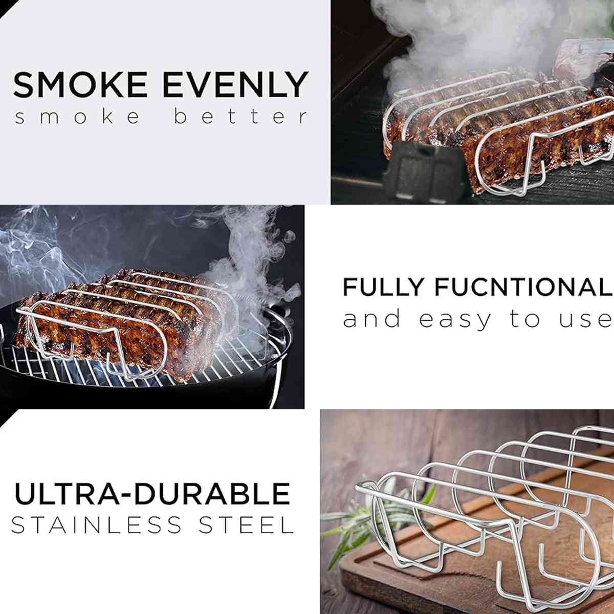 This BBQ rack is the ideal grilling accessory for smoking or roasting ribs outdoors.Made from high-quality stainless steel, it features curved slots that hold meat securely upright for even heat distribution and authentic barbecue flavour.Its open-frame design allows easy access to all sides of the ribs, promoting faster, more uniform cooking.Suitable for grills, ovens and smokers, it offers a practical solution for preparing multiple portions at once without crowding the grill space.