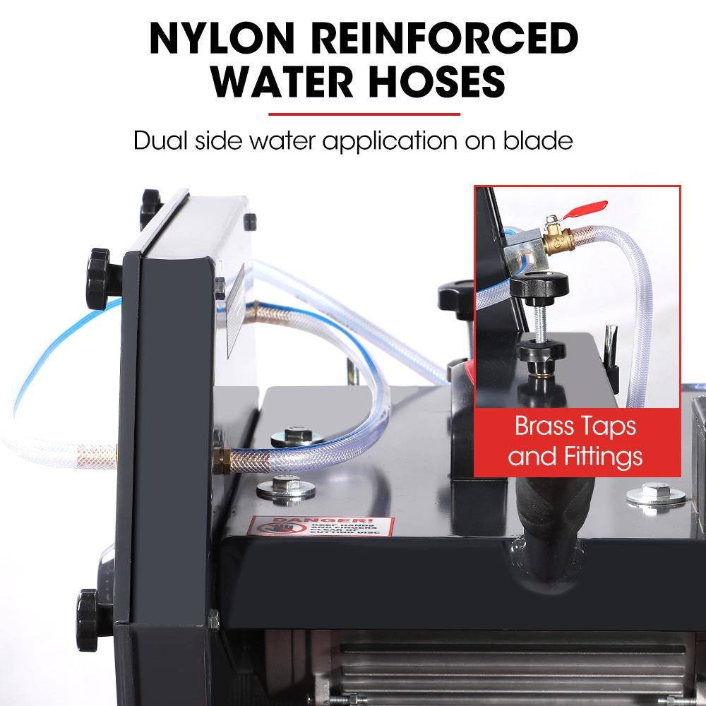 At its core, the BBS350 boasts a potent 2000W motor mounted on a spring loader armature ensuring smooth and precise cutting. The rail effortlessly pivots for bevel cuts, while the wet-cutting system is fueled by a reliable high-volume pump in the undertray reservoir, featuring a shielded water pipe for durability against typical knocks.