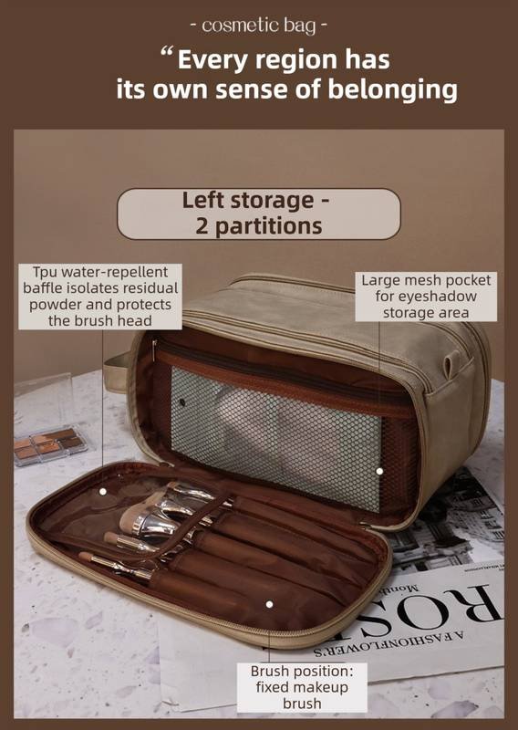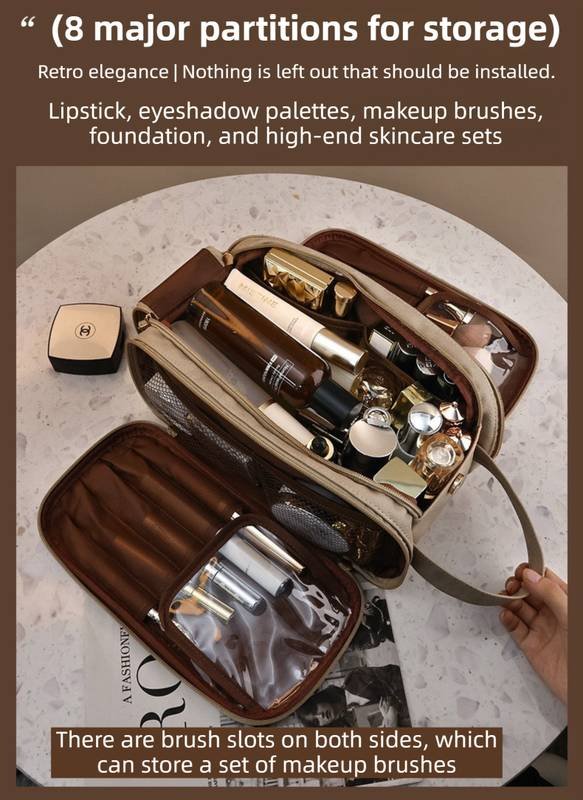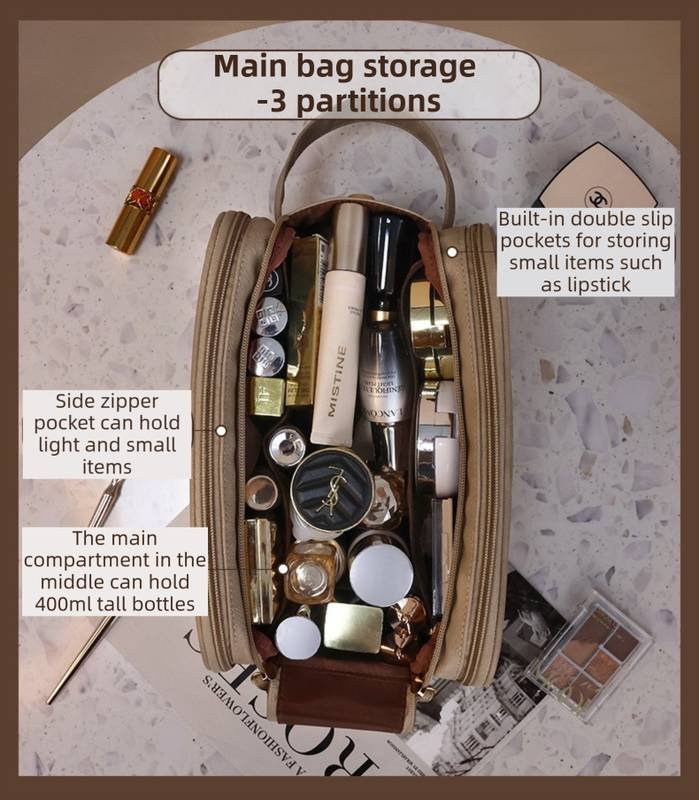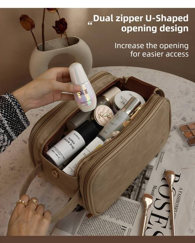 • Double-Layer Design: Features a dual-zipper system that opens into two spacious sections. Easily categorize your items: makeup on one side, skincare or toiletries on the other.