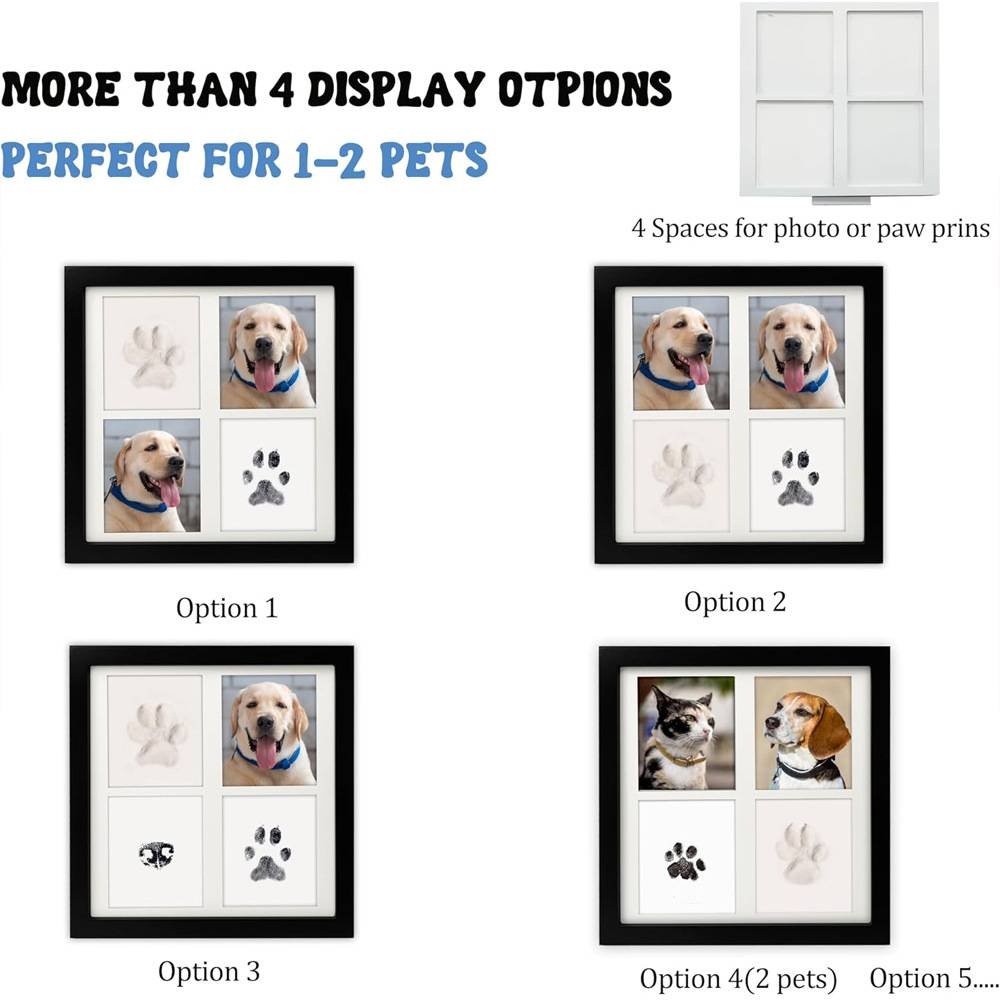 - Flexible Layout: The frame has four openings, each approximately 10.4cm x 11.3cm. Typically used to display two cherished photos and two paw prints, or you can customize it with four photos or a combination that suits you. Perfect for showcasing one or two pets.