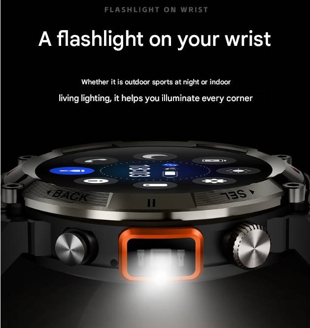 Designed for outdoor enthusiasts, this Outdoor Smartwatch features a 1.45-inch high-definition round screen for clear visibility in all conditions. Equipped with a built-in flashlight, it ensures safety during nighttime adventures, while information push notifications keep you connected on the go. Track your sports activities with ease, making it the perfect companion for hiking, running, and more.