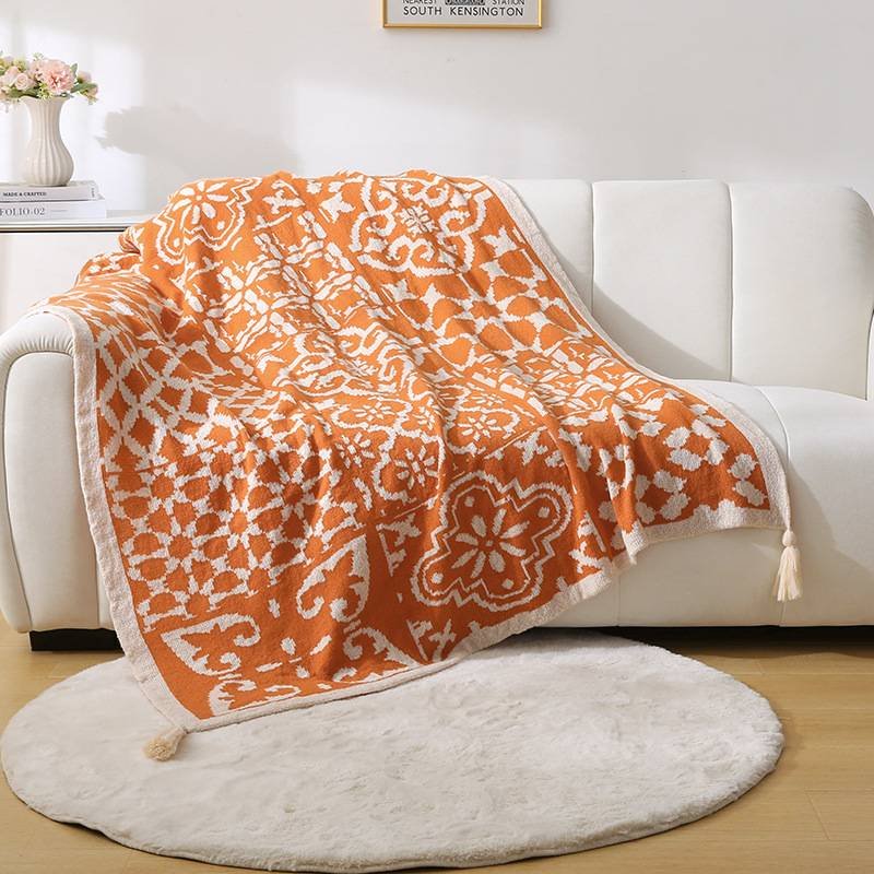Add a touch of bohemian charm to your space with the Bohemian Style Sofa Throw Blanket. Crafted from soft faux cashmere, this 130cm x 170cm blanket weighs 850g and is perfect for office naps, air-conditioned environments, or cozying up on your sofa. Featuring an intricate orange and white geometric pattern with tassel accents, it combines style and comfort for everyday use.