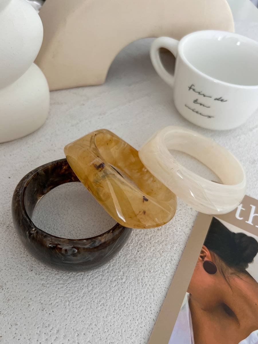 Elevate your accessory game with this bold wristwear. The Irregular Square Resin Bangle is designed for the woman who loves minimalist fashion with a twist. The wide 4cm profile ensures it stands out, serving as the focal point of your look. Because of its open, wide inner diameter, it slips on easily over the hand.