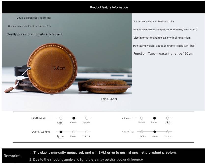 This beautifully crafted leather tape measure is the perfect blend of functionality and style. Made from genuine top-grain leather, this mini measuring tool is not only durable but also adds a touch of vintage charm to your everyday carry. The retractable design allows for easy use and storage, while the dual-scale (metric/imperial) ensures accurate measurements for any project.