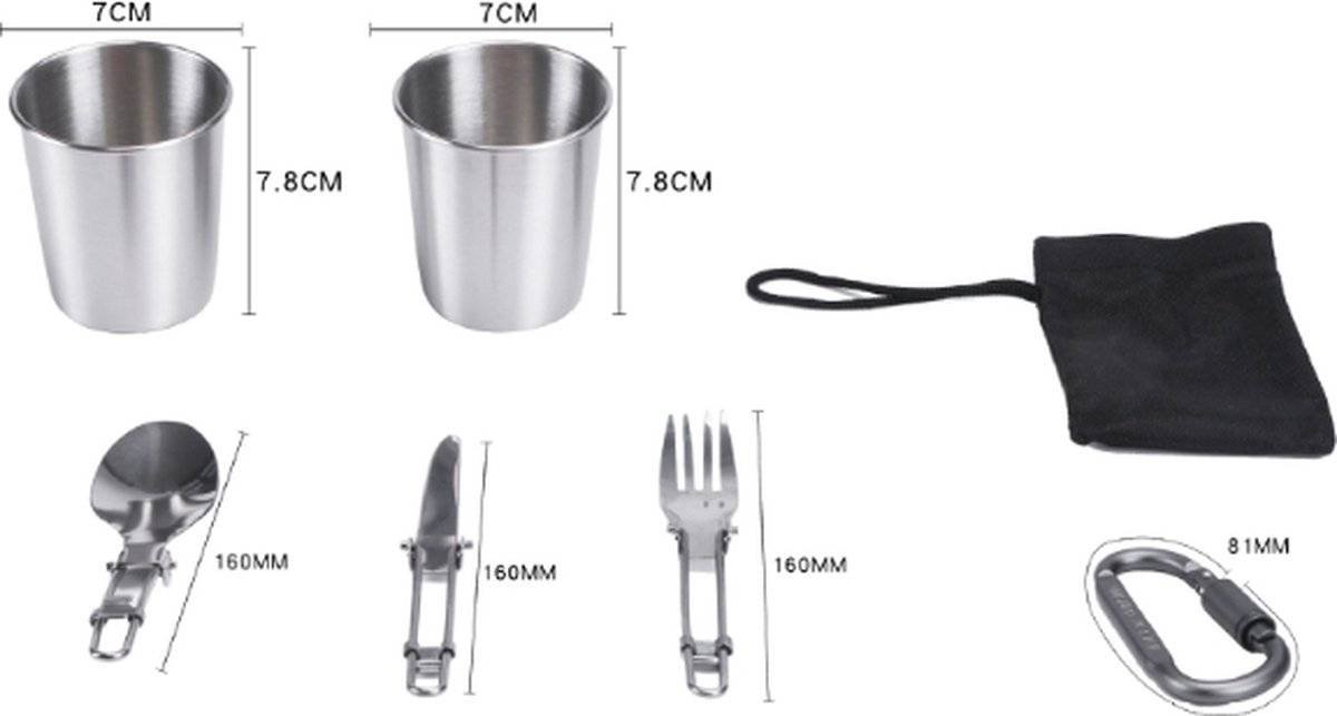 Product material: high-quality hard oxidized aluminum Cooking plate: 1pc, OD17.5CM / H9CM Frying pan: 1pc, diameter 18CM / height 4.5CM handle 10cm Teapot: 1pc, 1.1L, Diameter150CM / Height8CM Spoon specification: 160 * 40mm Knife: 165 * 12mm Fork specification: 160 * 12mm Lock: 70 * 81mm 304 stainless steel water cup: 2pcs 70 * 78mm 200ml Suitable for 2-3 people, including a large pot, a frying pan, a teapot, two 304 stainless steel cups, a fork, a spoon, a dinner knife, a lock buckle, set of pots and pans made of aluminum alloy, after high-quality hard treatment, resistant to high temperature and wear. The knife, fork and spoon are made of 410 stainless steel. Selected 304 stainless steel cups, specially tailored, can be put in the teapot, easy to carry. 9-piece high-quality outdoor tableware – compact and easy to carry Material: high-quality aluminum. Robust, durable and well-finished, safe and BPA- Easy to clean and store. Folding design saves space and makes the set compact. even hang on a backpack Perfect for camping, backpacking, hiking, emergency planning, or as part of a survival kit, etc.