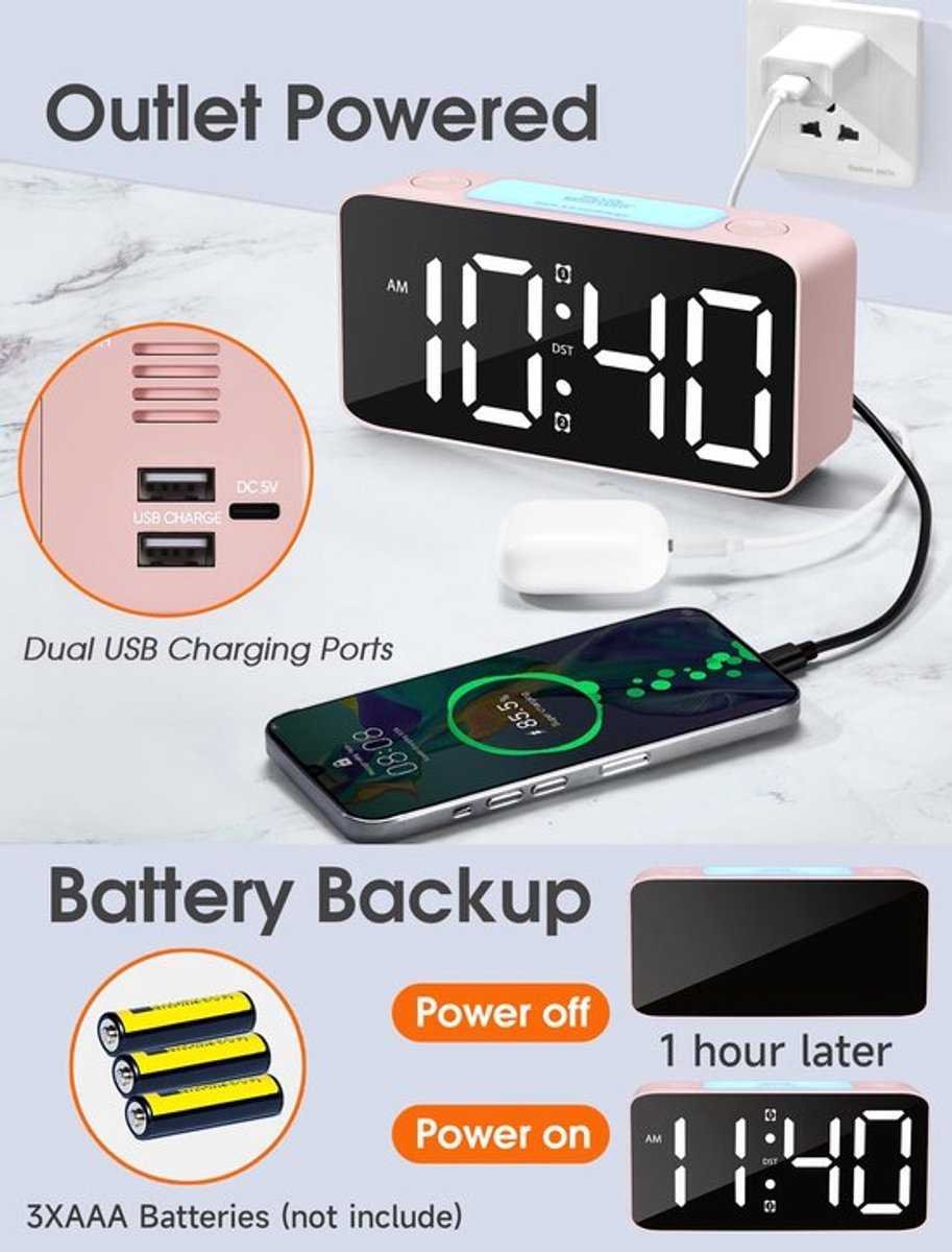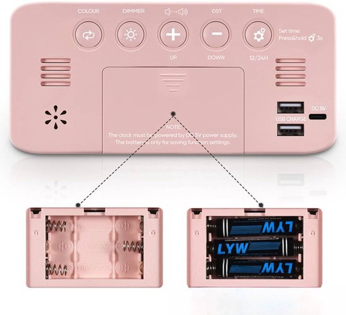 Digital Night Light – Klok Extra Powerful – 7 Colors – Ideal for Heavy Sleepers – Adjustable Volume and USB Charging – Place on the Bedside Table – Pink