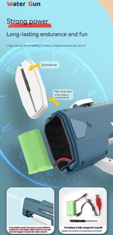 Level up your water warfare with this futuristic 46cm Electric Pulse Water Gun. Featuring a striking blue design with built-in LED lighting effects (“Brilliant Lighting”), this blaster looks as cool as it performs, making it perfect for day or night battles at the beach, pool, or backyard. Unlike standard water guns, this model offers a versatile “Hand-Self Integrated” system, allowing for automatic electric firing while retaining manual playability, ensuring the fun doesn’t stop even if the battery runs low.