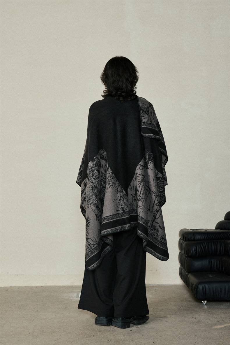 Faux Cashmere Shawl (Qingming Scroll Print) – Black Gray, 160*135cm