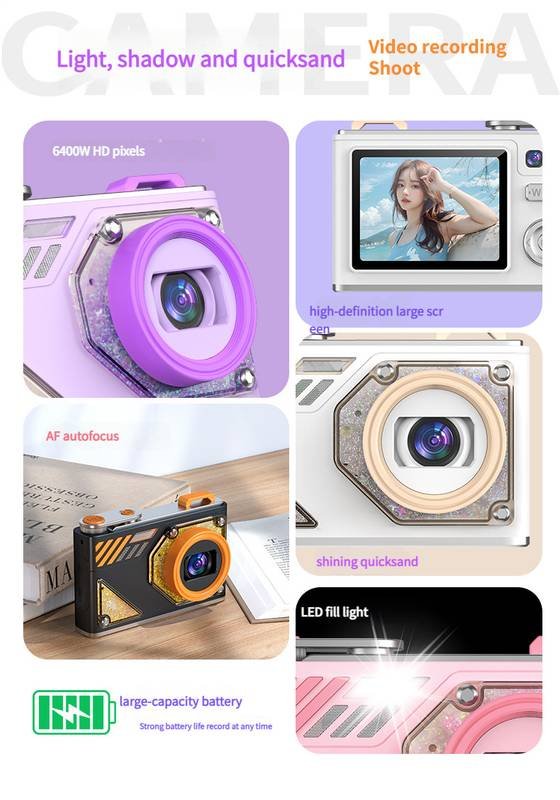 Capture life’s moments with this portable digital camera featuring a unique glitter sand exterior design. Equipped with dual high-definition lenses and built-in LED fill light for enhanced low-light photography. The 2.8-inch display provides clear image preview and playback.