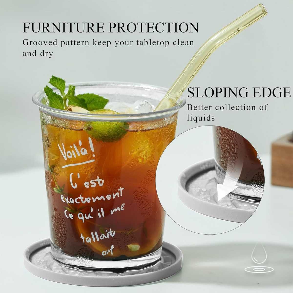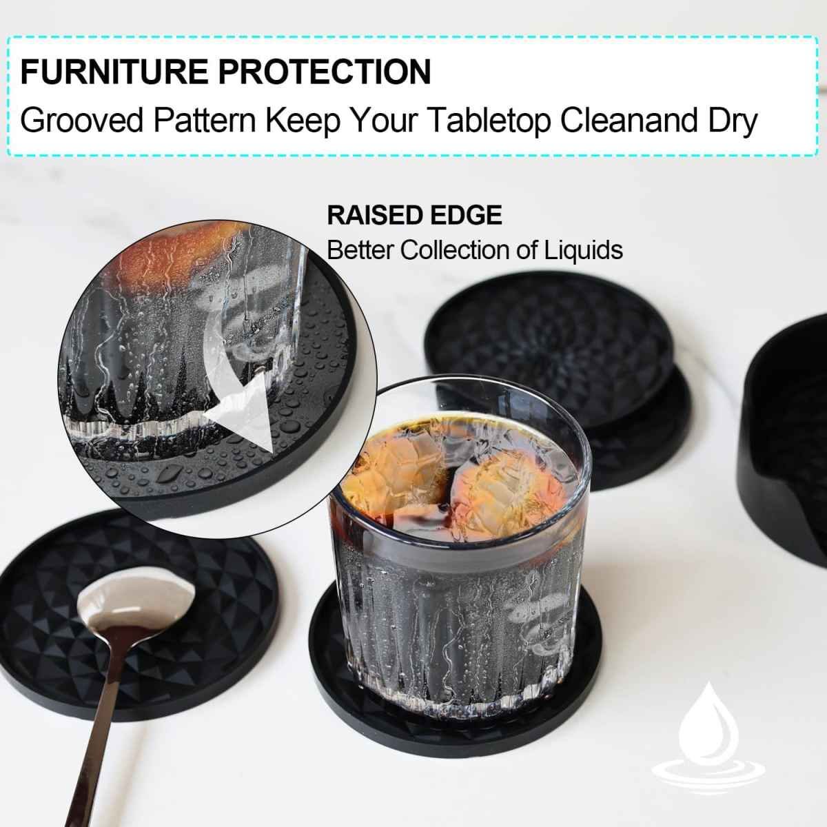 • Absorbent Grooved Design: The unique geometric pattern isn’t just for looks; the grooves help catch condensation and spills, while the raised edge further prevents liquids from running onto your surfaces. Keeps tabletops clean and dry.