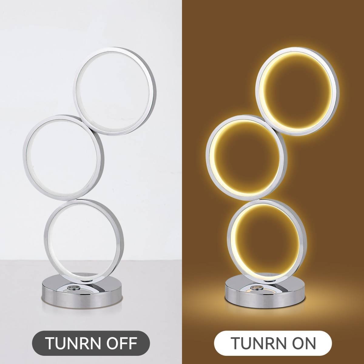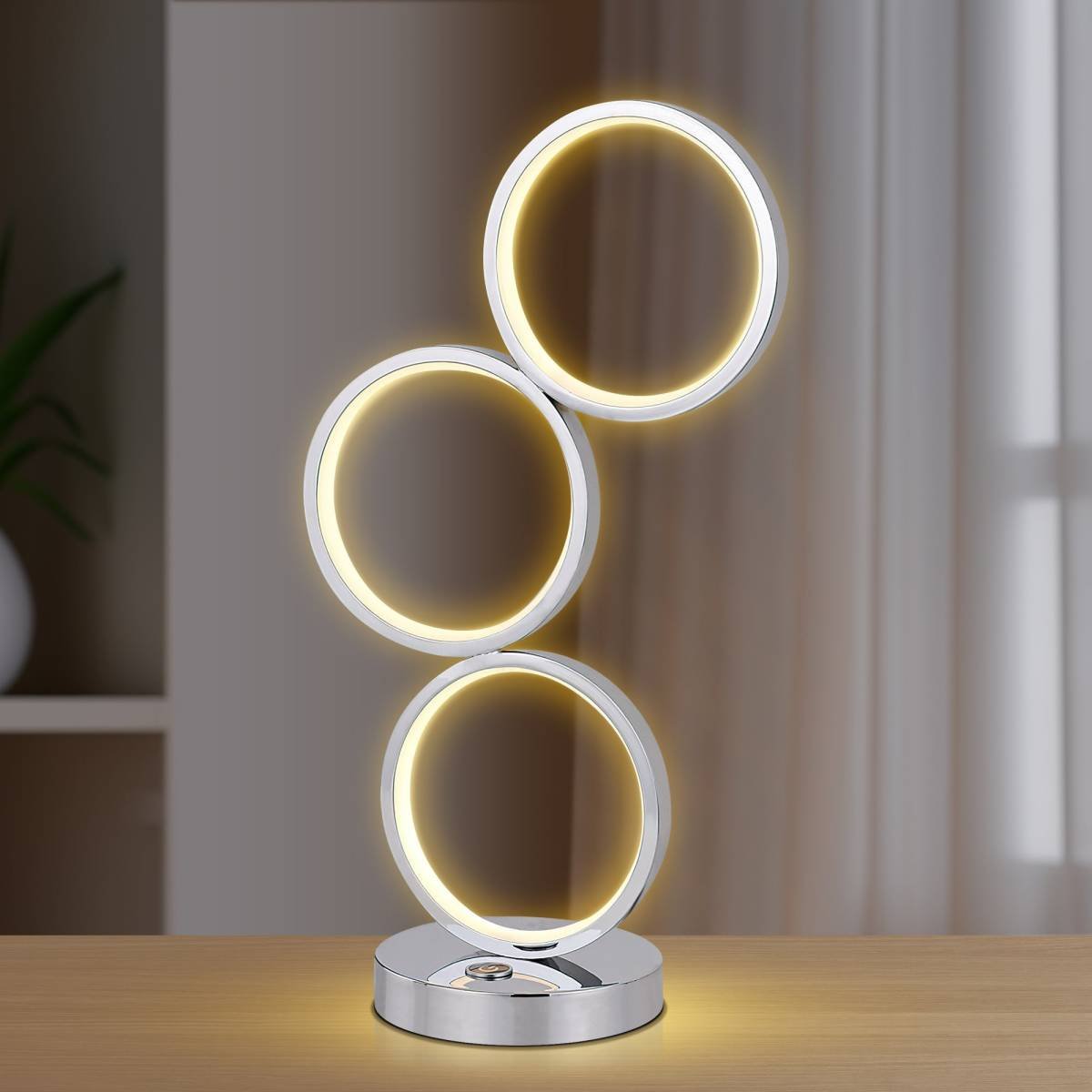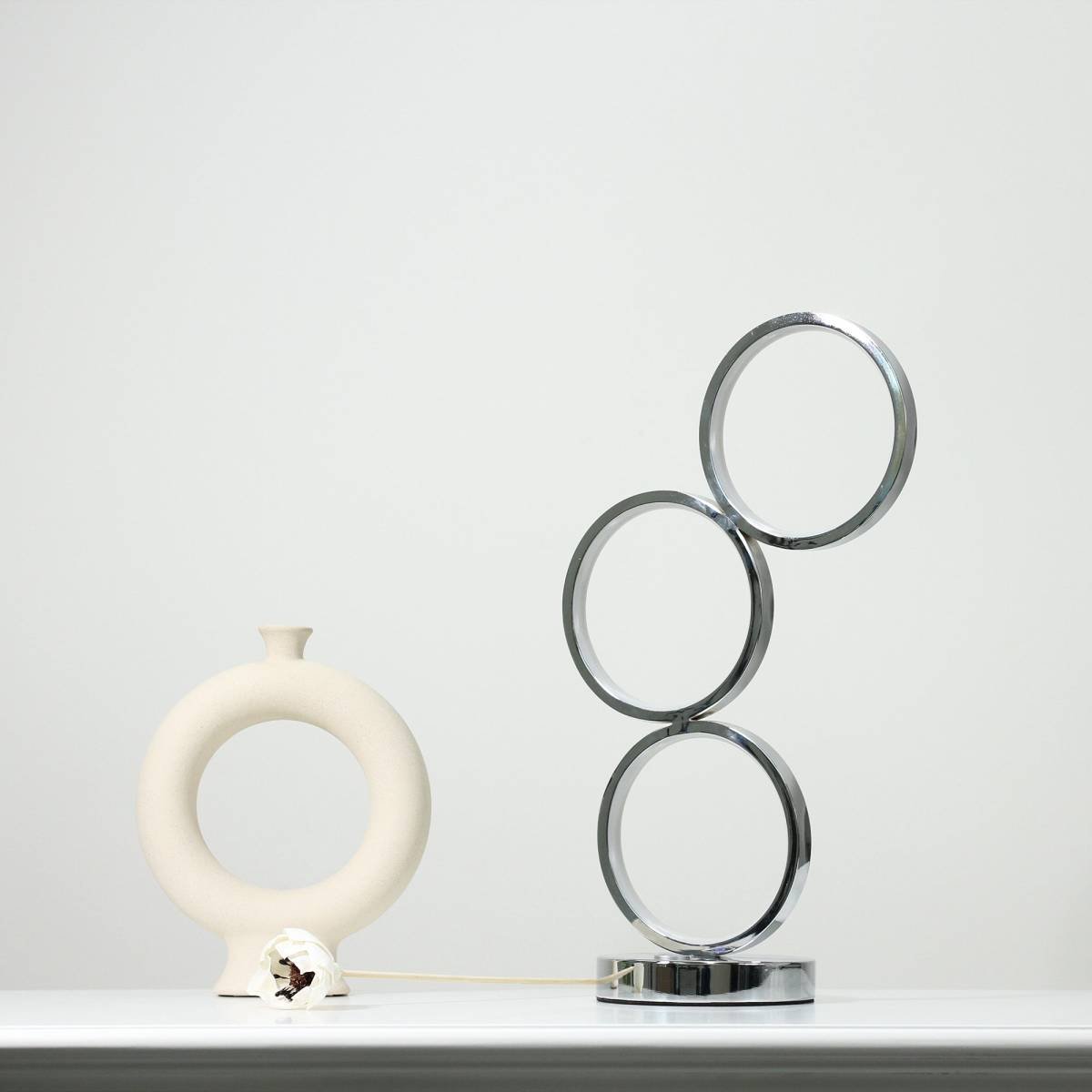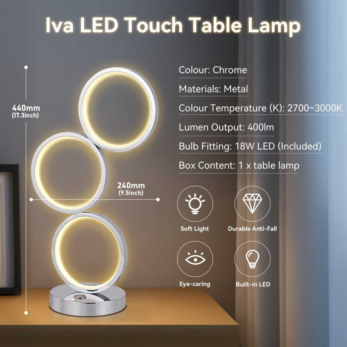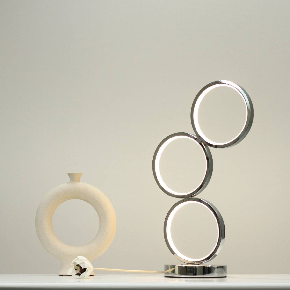 The Iva LED Table Lamp is a beautiful design with three unique circular LED lights that sit upon each other in an unbalanced and misaligned way. The circle€s inner lights up when illuminated by the touch switch on its circular base.