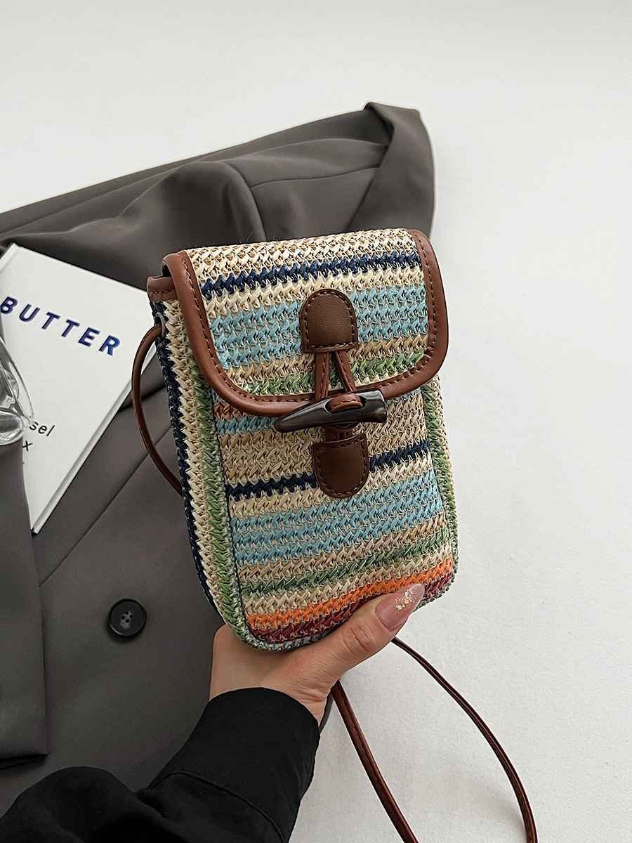 Khaki Boho Chic Woven Straw Crossbody Bag – Colourful Striped Mini Phone Pouch with Toggle Closure