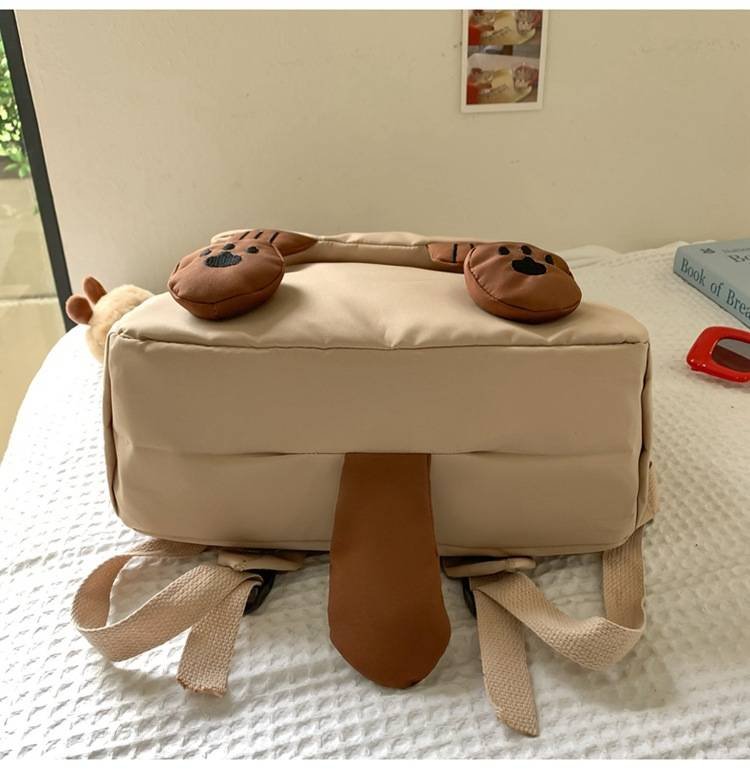 Khaki Lightweight Nylon Waterproof Schoolbag for Children – Large Capacity Daypack with Ugly-Cute Cat Design