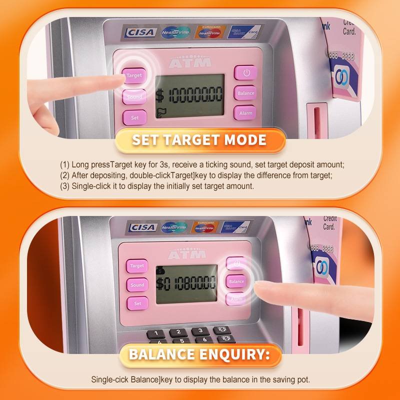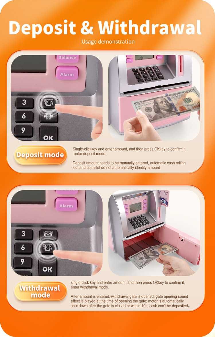 - Deposit & Withdrawal Functions: Allows kids to deposit money and make simulated withdrawals by entering the amount, opening the withdrawal gate with sound effects.