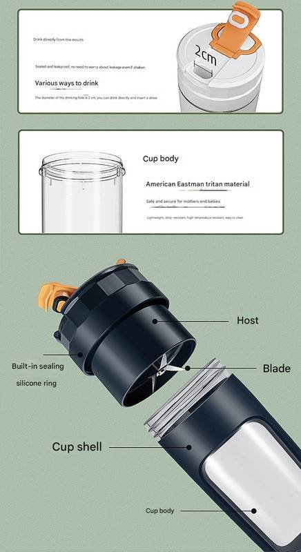 • Material: Cup Body – TRITAN, Outer Shell – ABS, Blade – 304 Stainless Steel