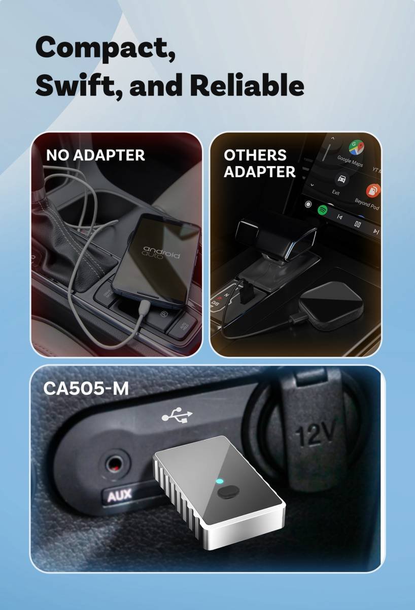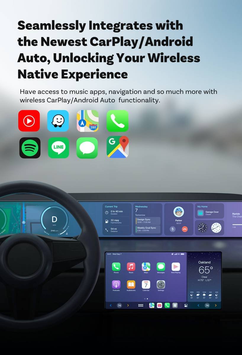 - Wireless Freedom: Effortlessly converts your existing wired Apple CarPlay and wired Android Auto systems to wireless.