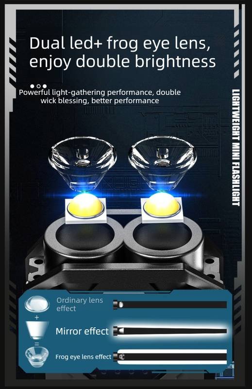 • Dual LED Core: Features two high-performance LED chips with “frog eye” lenses that amplify brightness and range, delivering powerful illumination from a pocket-sized device.