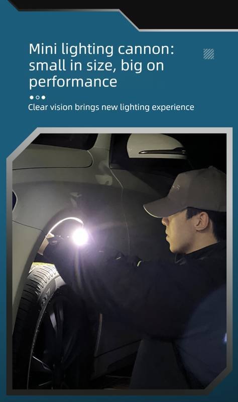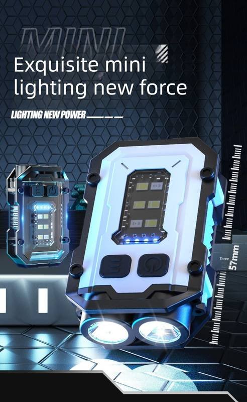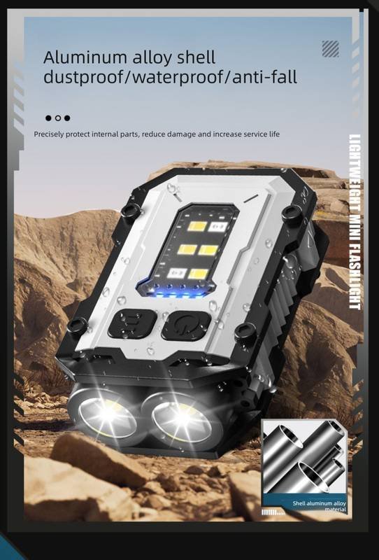 This multifunctional mini torch is designed for versatility. The main dual lights provide a focused beam for distance, while the side COB panel offers a floodlight effect, ideal for lighting up a tent or workspace without blinding glare. The interface is intuitive, with independent switches to control the main and side lights.