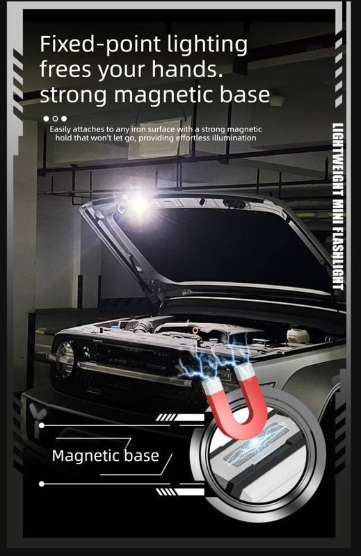 • Hands-Free Convenience: Equipped with a strong magnetic base to attach to metal surfaces (like a car bonnet) and a durable back clip to attach to hats or pockets, turning it into a makeshift headlamp or work light.