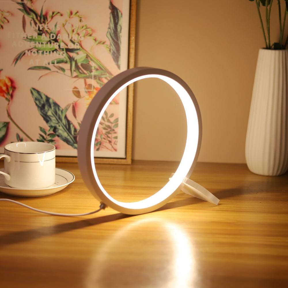 Enhance your bedroom, dorm, or office with this sleek and versatile Circular LED Ring Lamp. Its simple design not only adds a touch of modern elegance, but also provides eye-friendly lighting. Powered conveniently via USB, this lamp is perfect as a desk light, bedside lamp, or a gentle night light.