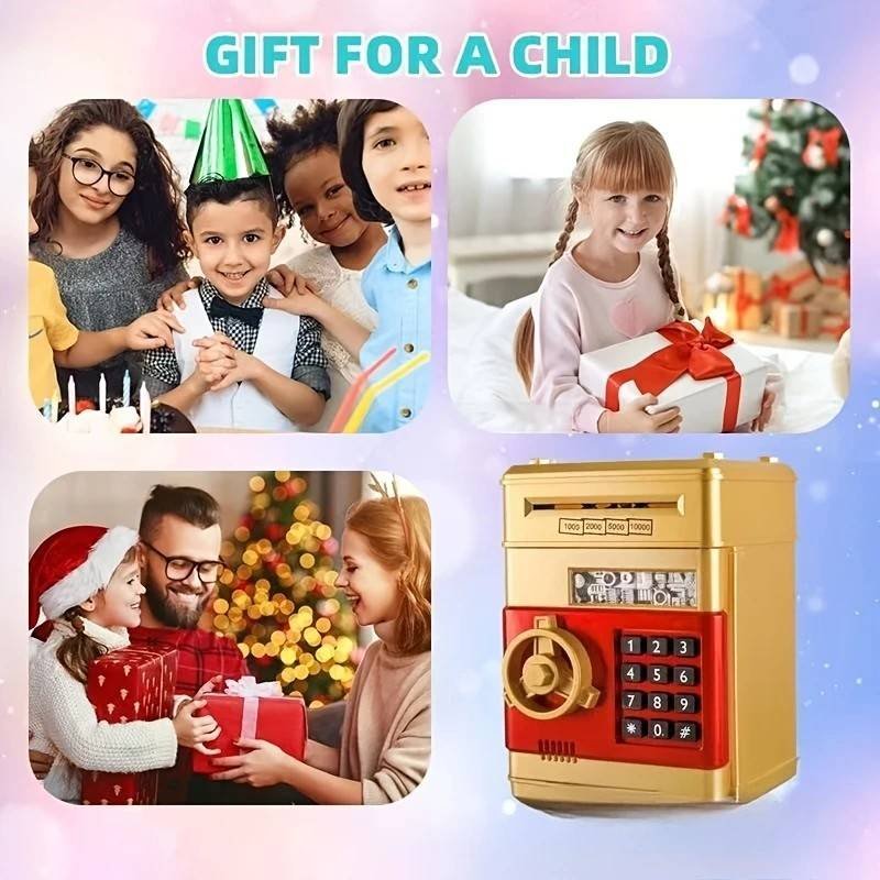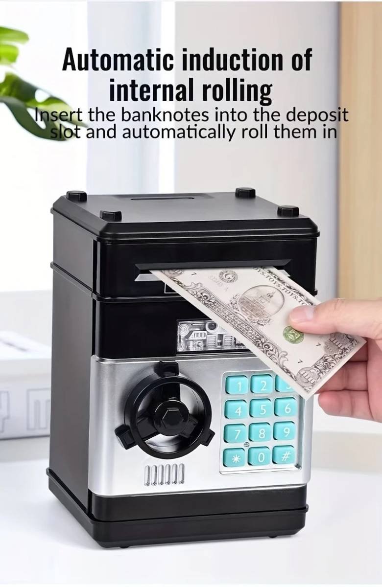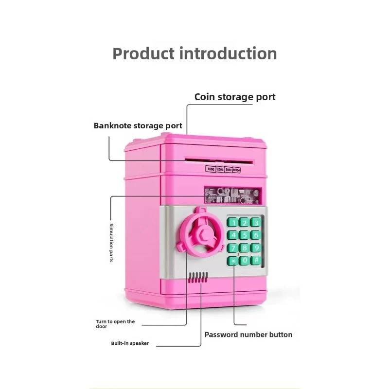 This children’s password piggy bank is a fun and educational tool that combines entertainment with financial literacy. Made of sturdy materials, it supports both coin and paper money storage: the top features a coin slot, and inserting paper money into the front bill slot triggers an automatic roll-in with accompanying music. It is equipped with a password keypad (default password 0000, modifiable by pressing the “*” key) entering the password automatically rotates the cabinet door open. Indicator lights and sound effects are also included to enhance the interactive experience.