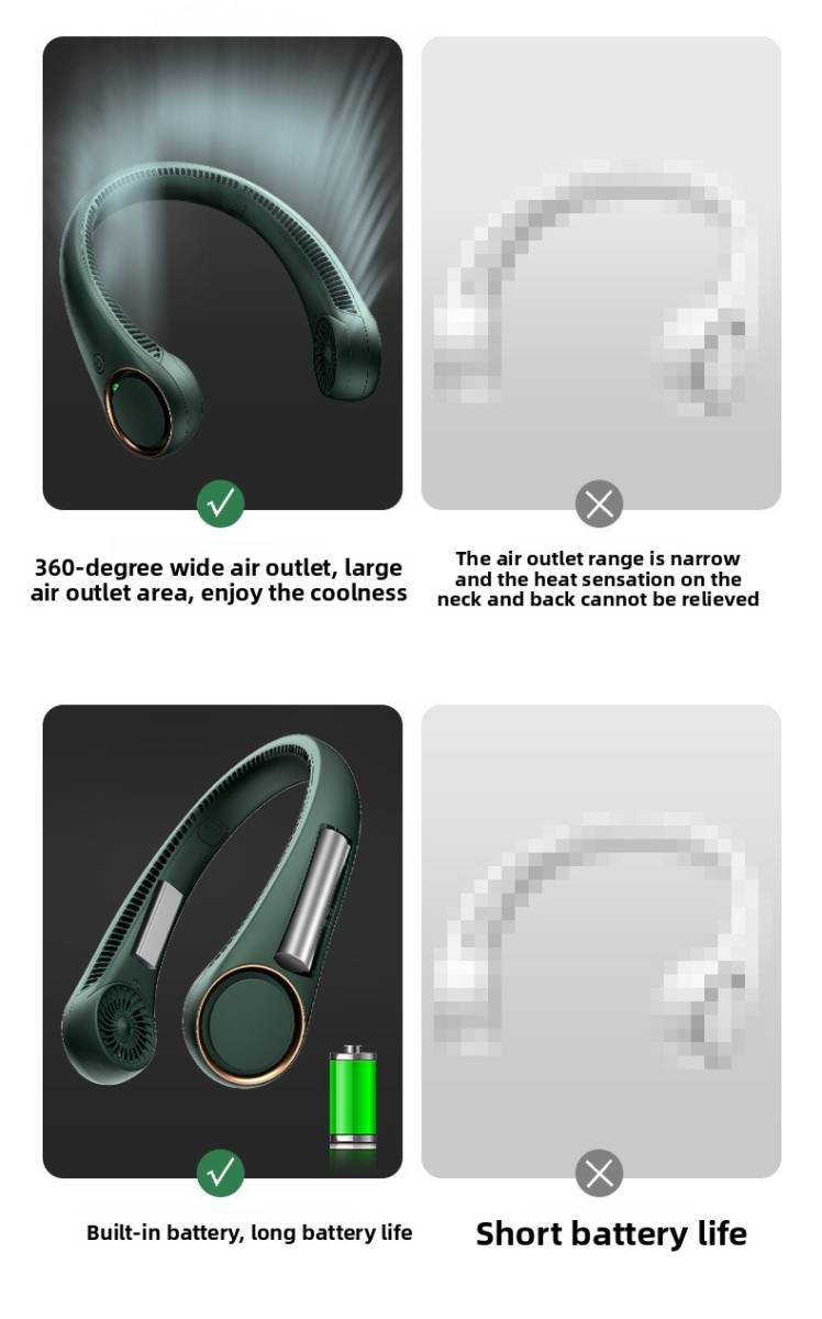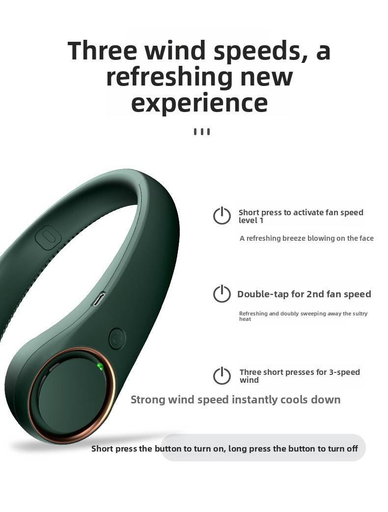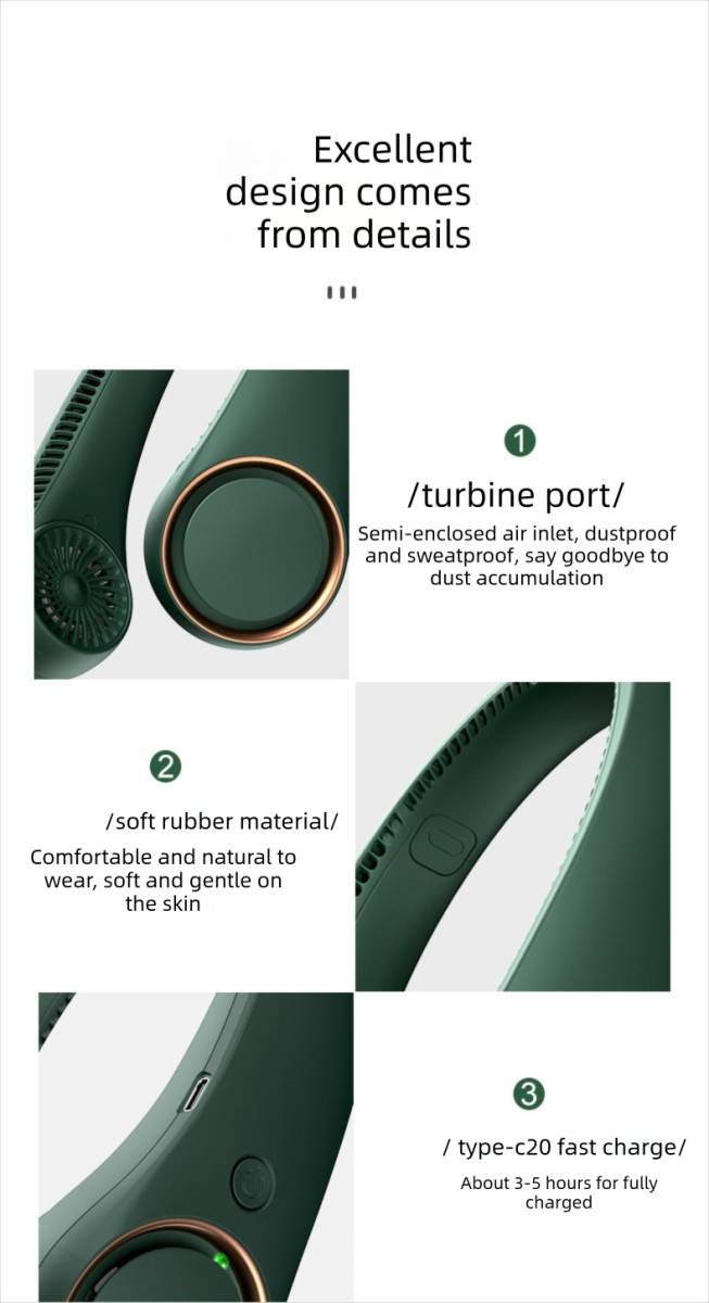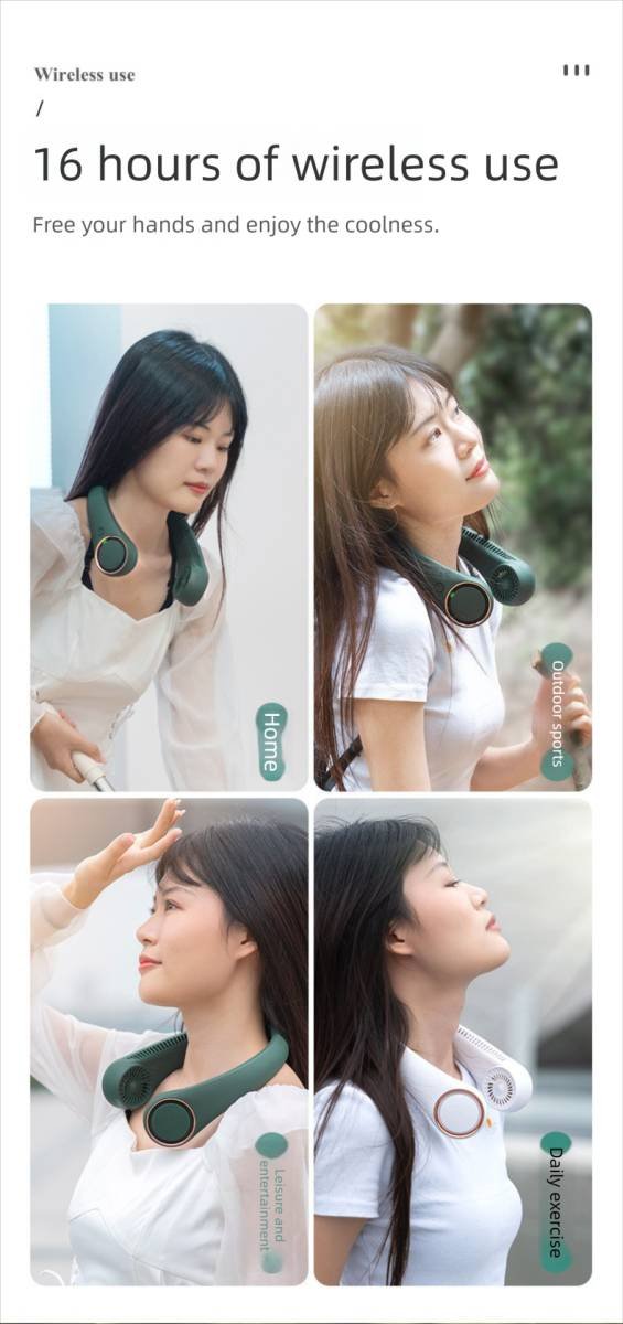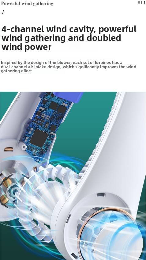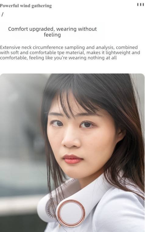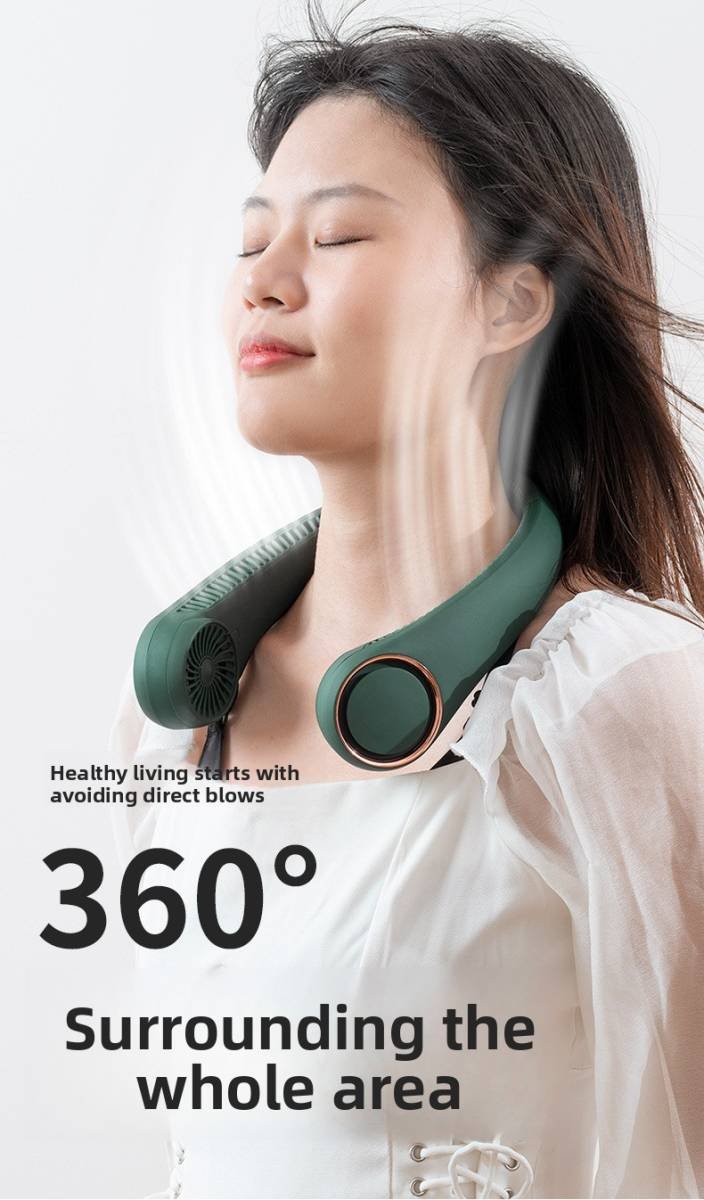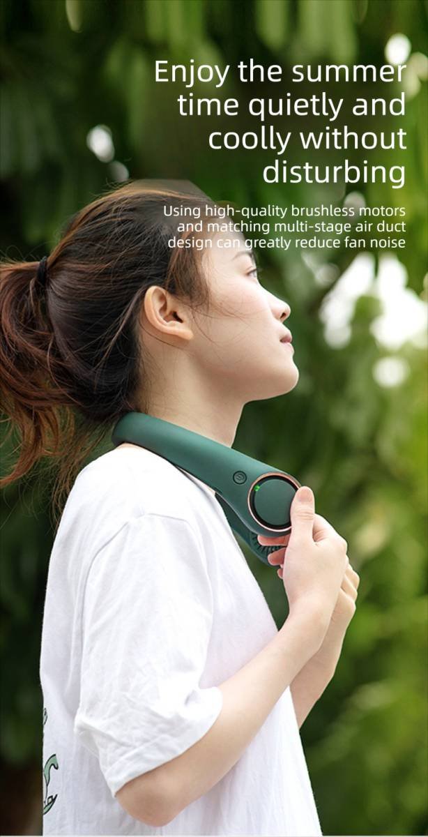 The Z6 Portable Neck Fan redefines personal cooling with its ergonomic headphone-style design. Unlike traditional fans that blow air directly at your face causing discomfort, this model uses a unique slope air guide system to disperse wind layer by layer, creating a sensation similar to a natural forest breeze. It features dual-channel air intakes and a twin-turbo design to gather air efficiently and double the cooling effect.