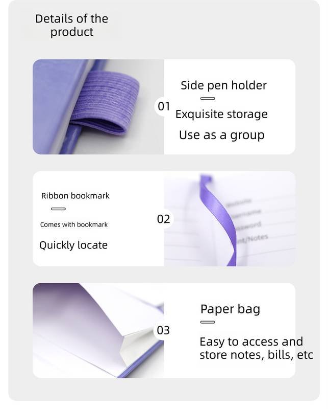 - Functional Design: Equipped with a convenient elastic pen loop, a ribbon bookmark for easy place-keeping, an elastic closure band to keep the book shut, and a back pocket for storing loose notes or receipts.