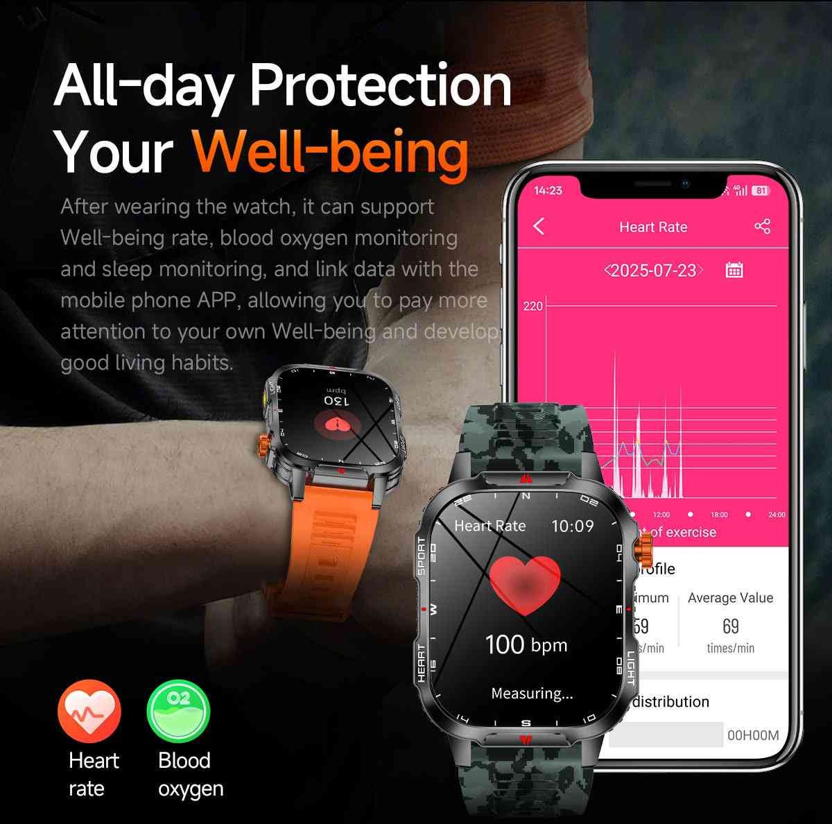 This smartwatch is designed to be your reliable companion for both daily life and extreme adventures. The 2.01-inch screen offers an expansive visual experience, protected by highly reinforced glass that resists scratches and impacts. With a fully customisable interface, you can choose from over 200 watch faces to match your style or occasion. The intuitive multi-menu mode allows for smooth navigation through apps and settings.