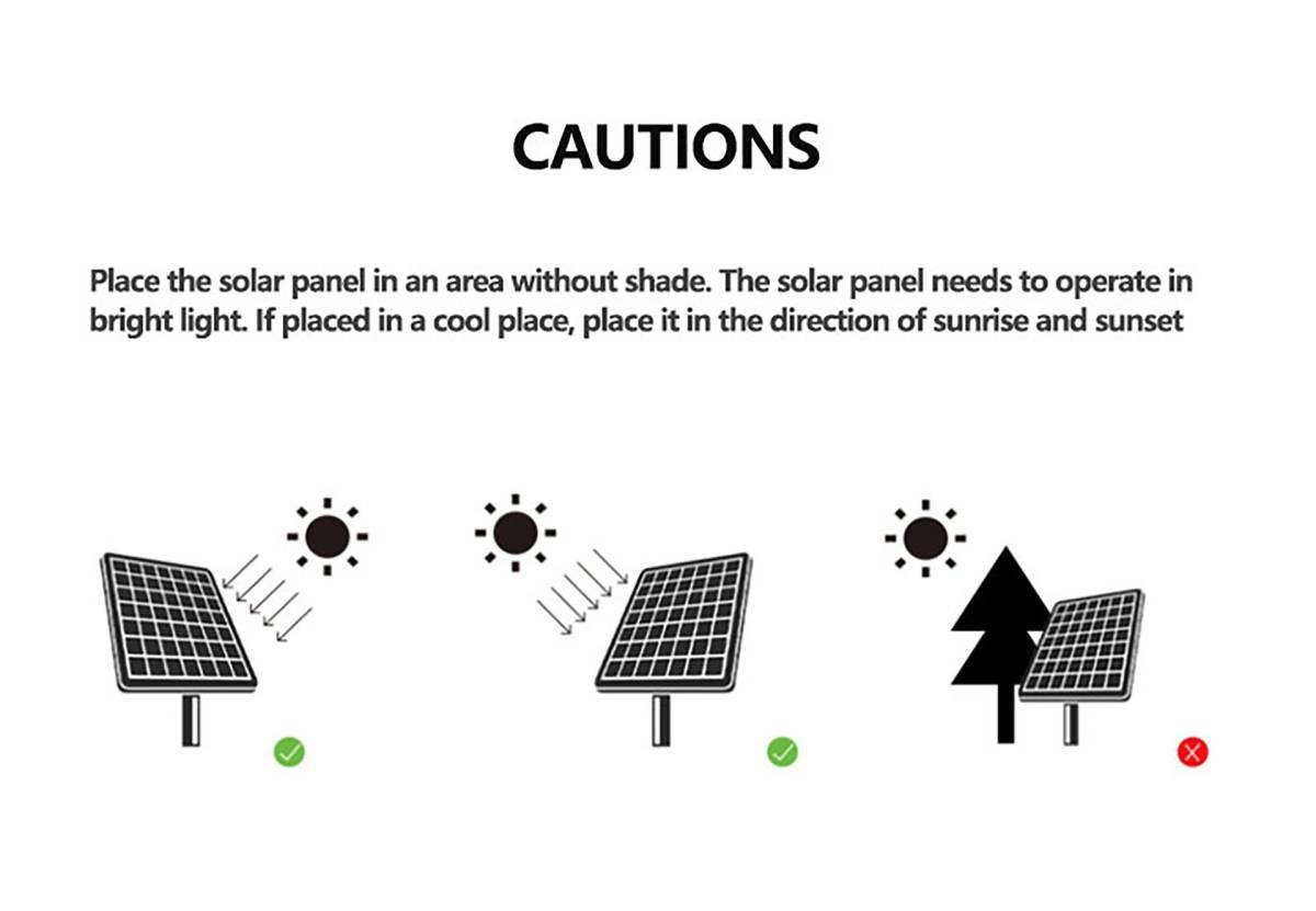 - Place the solar panel in a location with maximum sun exposure—no shade, preferably facing south (in the Northern Hemisphere) or north (in the Southern Hemisphere).