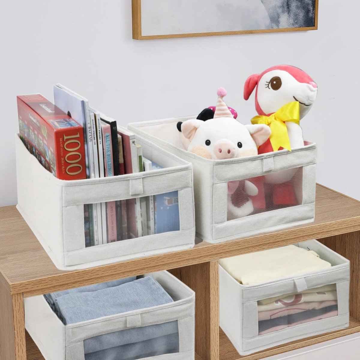 Linen Storage Boxes with Clear Window: These 4 versatile closet organizers can be used to store clothes, toys, books, and more. These boxes are also perfect for storing folded clothes, pants, jeans, sweaters, shirts, and baby clothes. Large Capacity: This pack contains 4 foldable boxes with a clear window, measuring 40 (L) x 27 (W) x 17 (H) cm, making them larger and taller than standard sizes. Upgraded Material: These canvas boxes are made of high-quality fabric for added durability. Closet and Drawer Organizers: These closet organizers can be placed anywhere to keep clothes clean, hygienic, and odor-free. When not in use, the clothing organizers can be folded to save space. The intuitive design makes stored clothes easily visible. With these wardrobe organizers, you can store jeans, pants, sweaters, underwear, socks, scarves, shirts, dresses, leggings, skirts, T-shirts, and other items. These boxes also fit most wardrobes and closets. Product: Large storage box. Package contents: 4 pieces. Dimensions: 40 x 27 x 17 cm. Color: Beige. Technical details: Quantity: 4; Capacity: 490+ cubic centimeters; Dimensions: 40 x 27 x 17 cm; Weight: 350 grams; Style: Foldable; Pattern: Solid; Shape: Rectangular