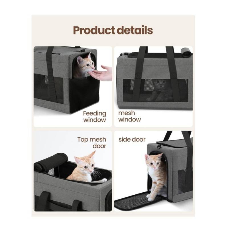 Travel with your furry friend in comfort and style with our Soft-Sided Pet Carrier. Designed for small pets, this carrier features a robust, built-in steel wire skeleton that prevents collapsing, ensuring a safe and spacious environment for your companion. The carrier is equipped with multiple mesh windows for excellent ventilation, a top mesh door for easy access, and a convenient side door. Thoughtful features include a side storage bag for snacks and toys, a roll-up sunshade curtain for protection, and a feeding window for easy treats. For enhanced safety during car trips, it includes an adjustable seat belt loop and zippers with a locking mechanism. The carrier is easy to assemble and can be carried using the comfortable top handles or the adjustable, detachable shoulder strap.