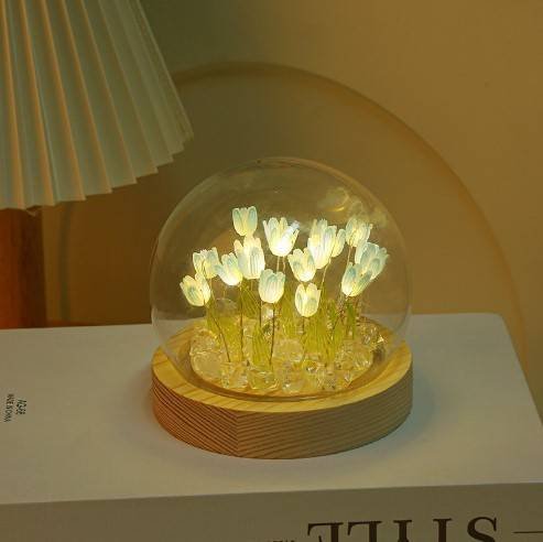 Create a warm and enchanting atmosphere with this Tulip Night Light. This design features delicate tulip flowers encased in a glass dome, complemented by a wooden base. USB powered for convenience, it’s the perfect desk decoration and creative gift idea.