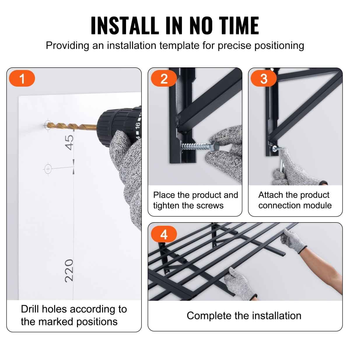The package includes positioning paper, cable ties, etc. This garage shelving heavy duty wall mounted is suitable for installation on concrete or wooden walls. If it’s a stud wall, please check the hole distance and not suitable for installation on metal walls.