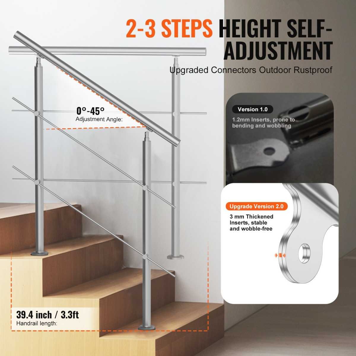 The handrail features an adjustable range from 0 to 45 degrees, making it ideal for most doorsteps, garage entrances, garden railings, and more. This flexibility allows it to accommodate various stair configurations effectively.