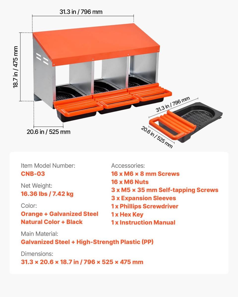 The nesting boxes are made of high-quality galvanized steel and strong, easy-to-clean plastic to ensure that they won’t rust or wear out over long periods of use and in harsh weather conditions. Additionally, our spacious laying boxes feature a large room with a ventilated design to ensure fresh air circulation and keep the nesting environment dry and cool.