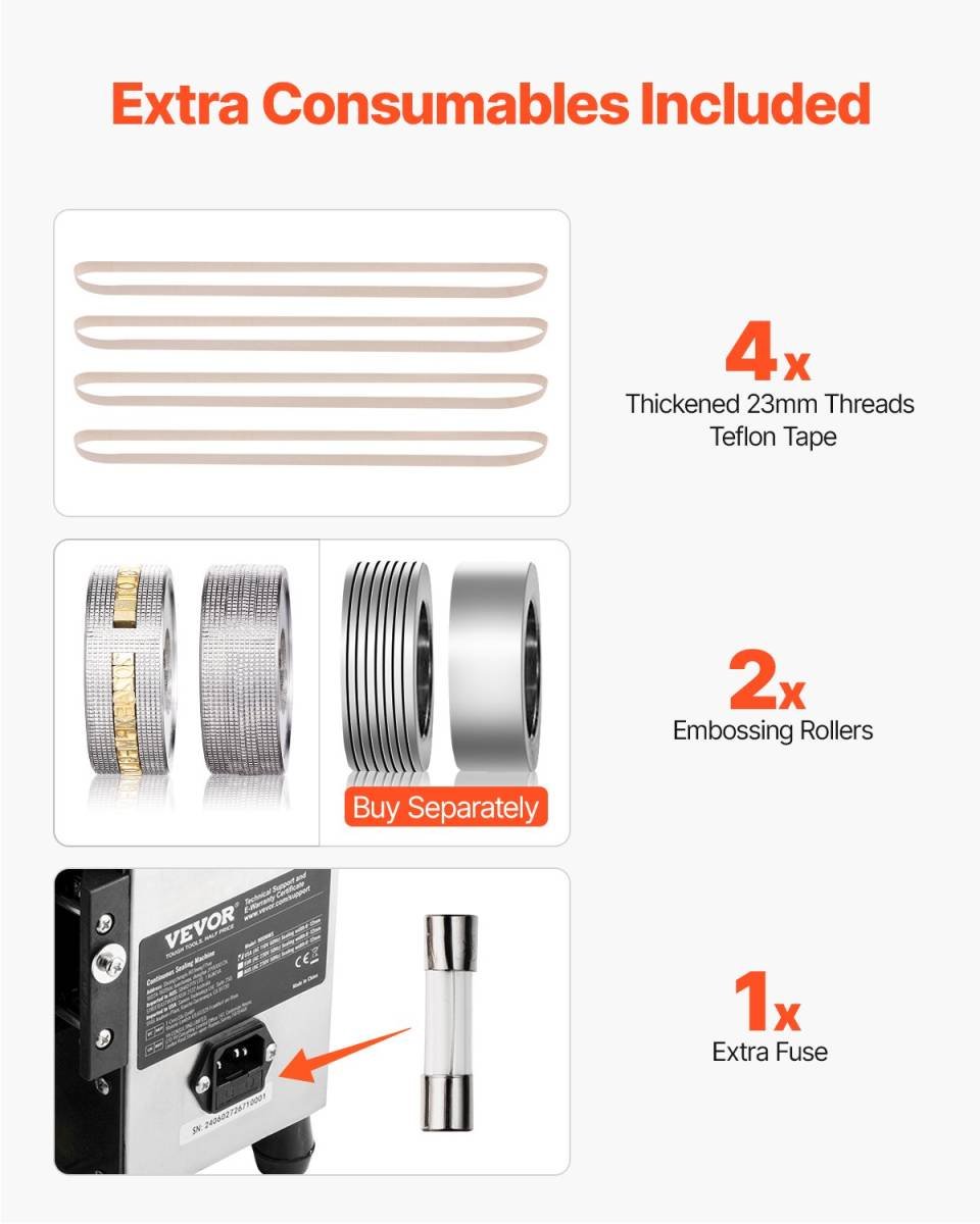 The band sealing machine includes toothed belts, Teflon belts, a fuse, and other accessories, ensuring backup and maintenance needs during prolonged use. This reduces maintenance costs and downtime risks, ensuring consistent production.