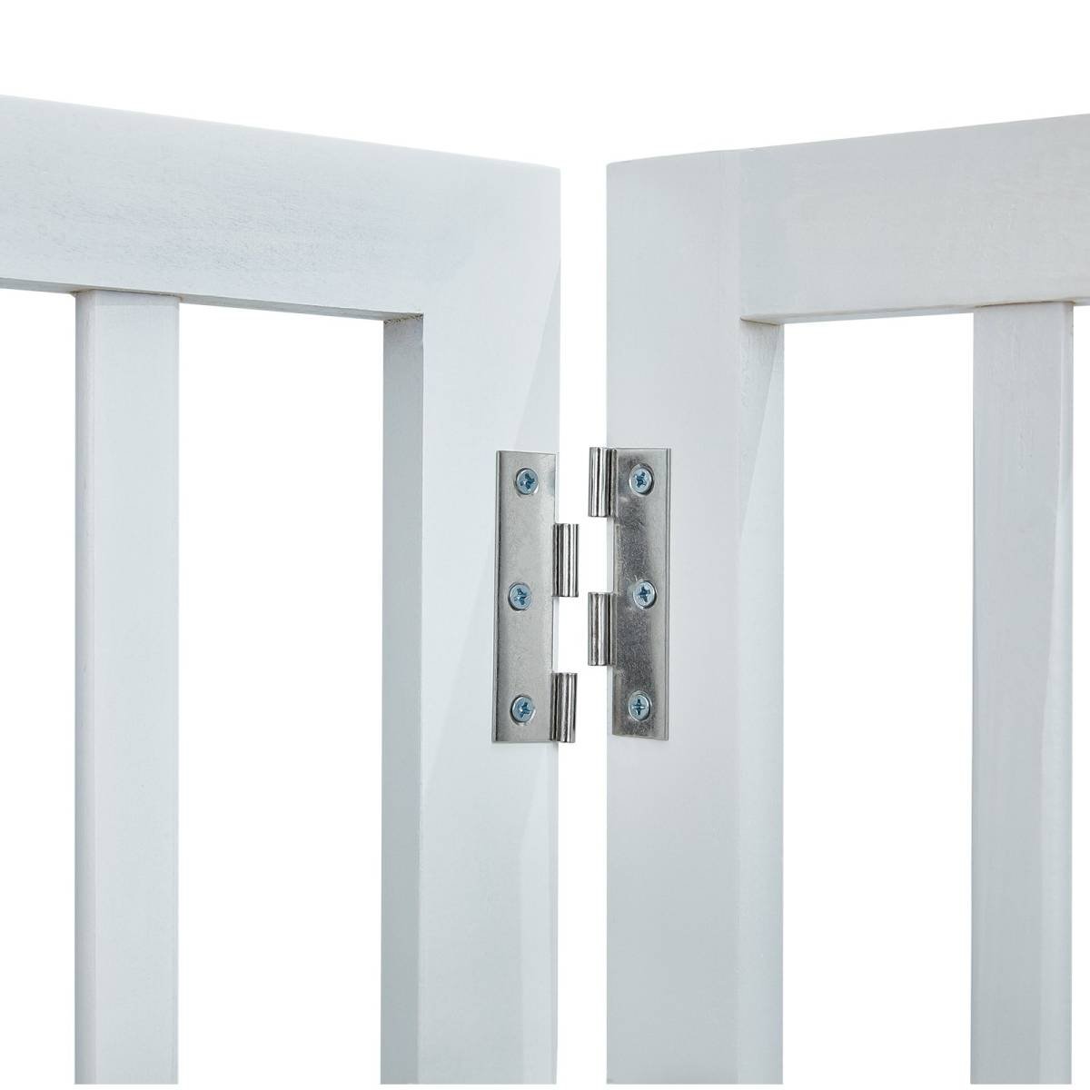 The fully extended width of our foldable dog gate is 60″. A single gate panel measures 20″ Wx 24″H. There are 3 panels in total.