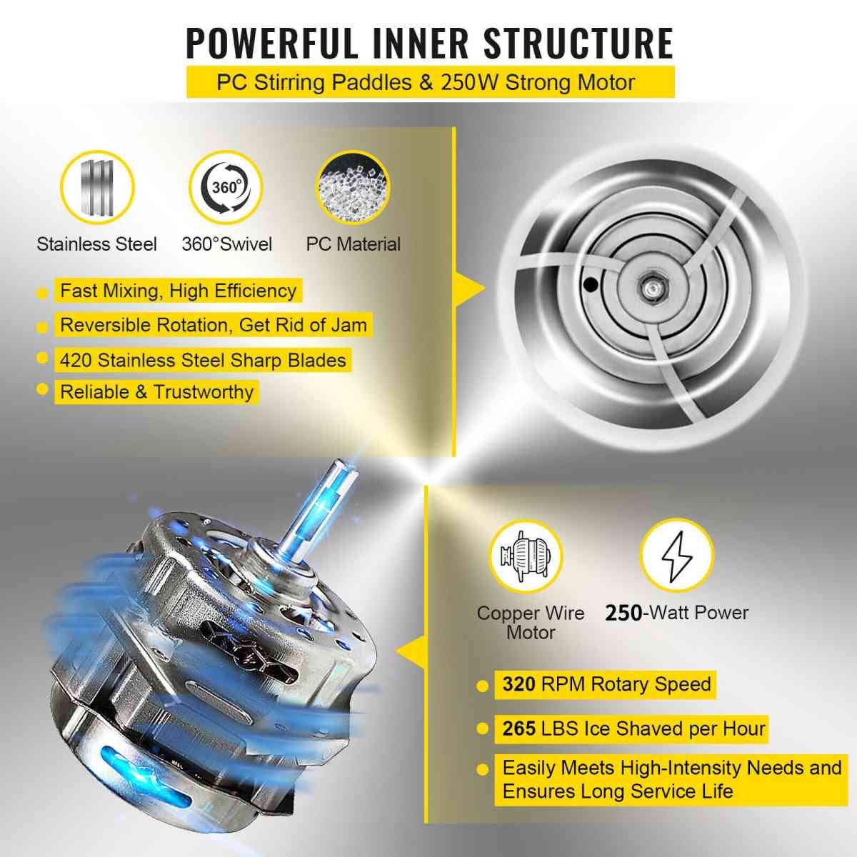 Crushes as huge an amount of 265 lbs (120 kg) per hour with powerful 250-watt copper motor, featuring a 420 stainless steel sharp blade with the rotate speed of 320 RPM. One spare blade is included with your ice crusher machine for hassle-free replacement.