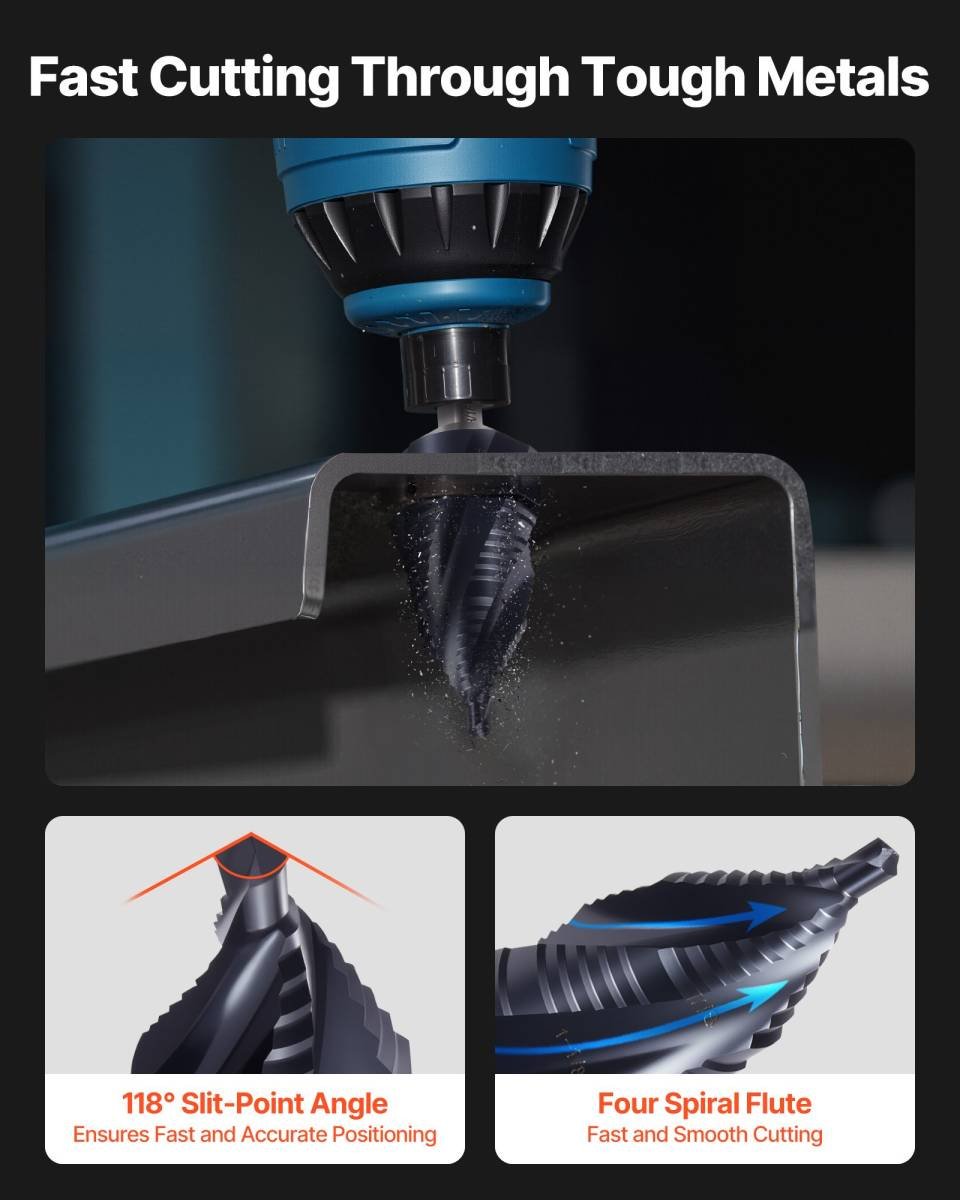 Our step drill bit for metal features a 118° tip and four-flute design, ensuring fast chip clearing, less heat buildup, and clean, burr-free holes in wood, plastic, and fiberglass