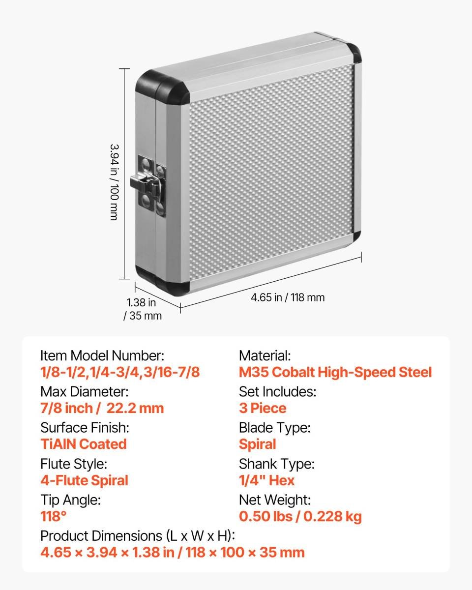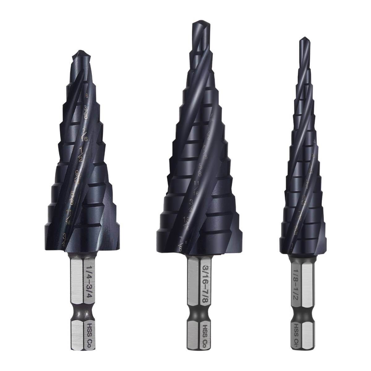 VEVOR Step Drill Bit Set, 3.2 – 22.2 mm, 3 Pieces Step Drill Bits, 6.35 mm Hex Shank, TiAlN Coating Cobalt HSS High Speed Steel, for Metal, Stainless Steel, Aluminum, Wood, Plastic, Fiberglass